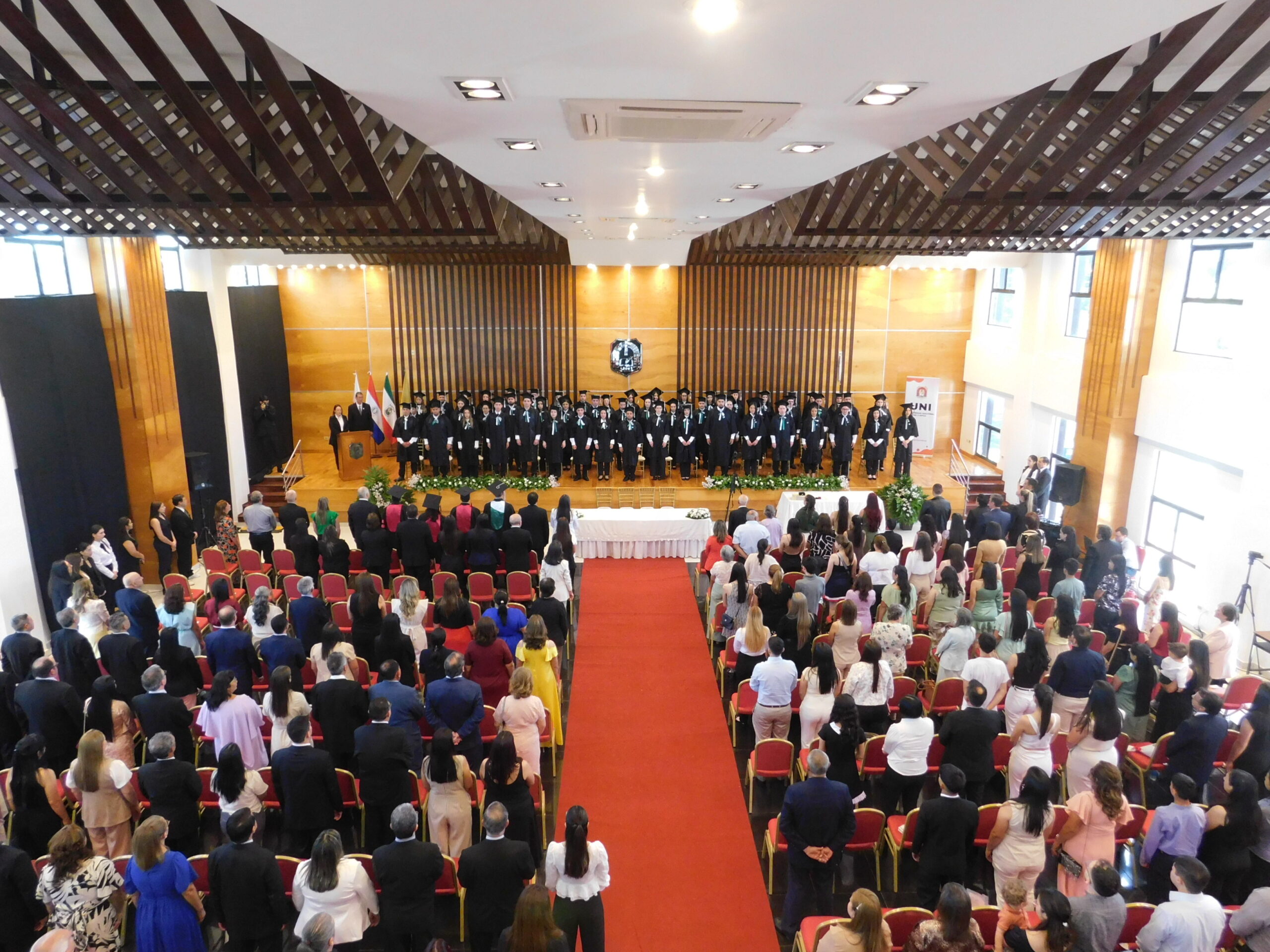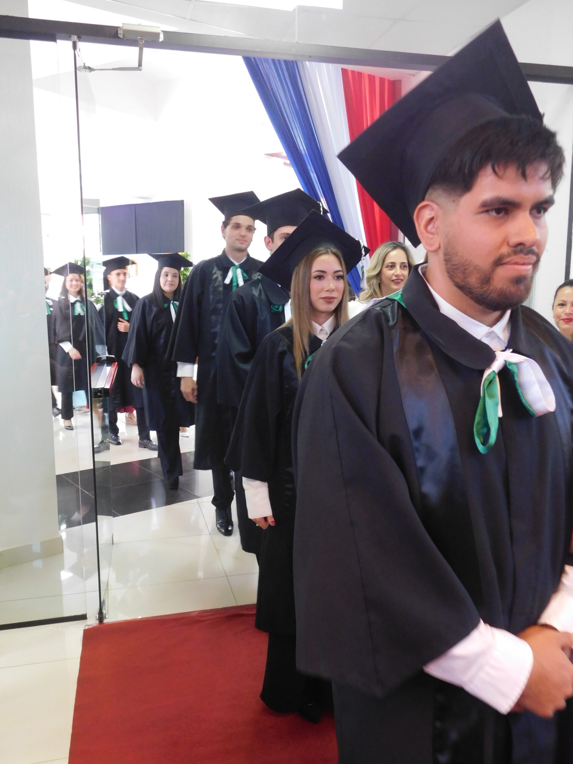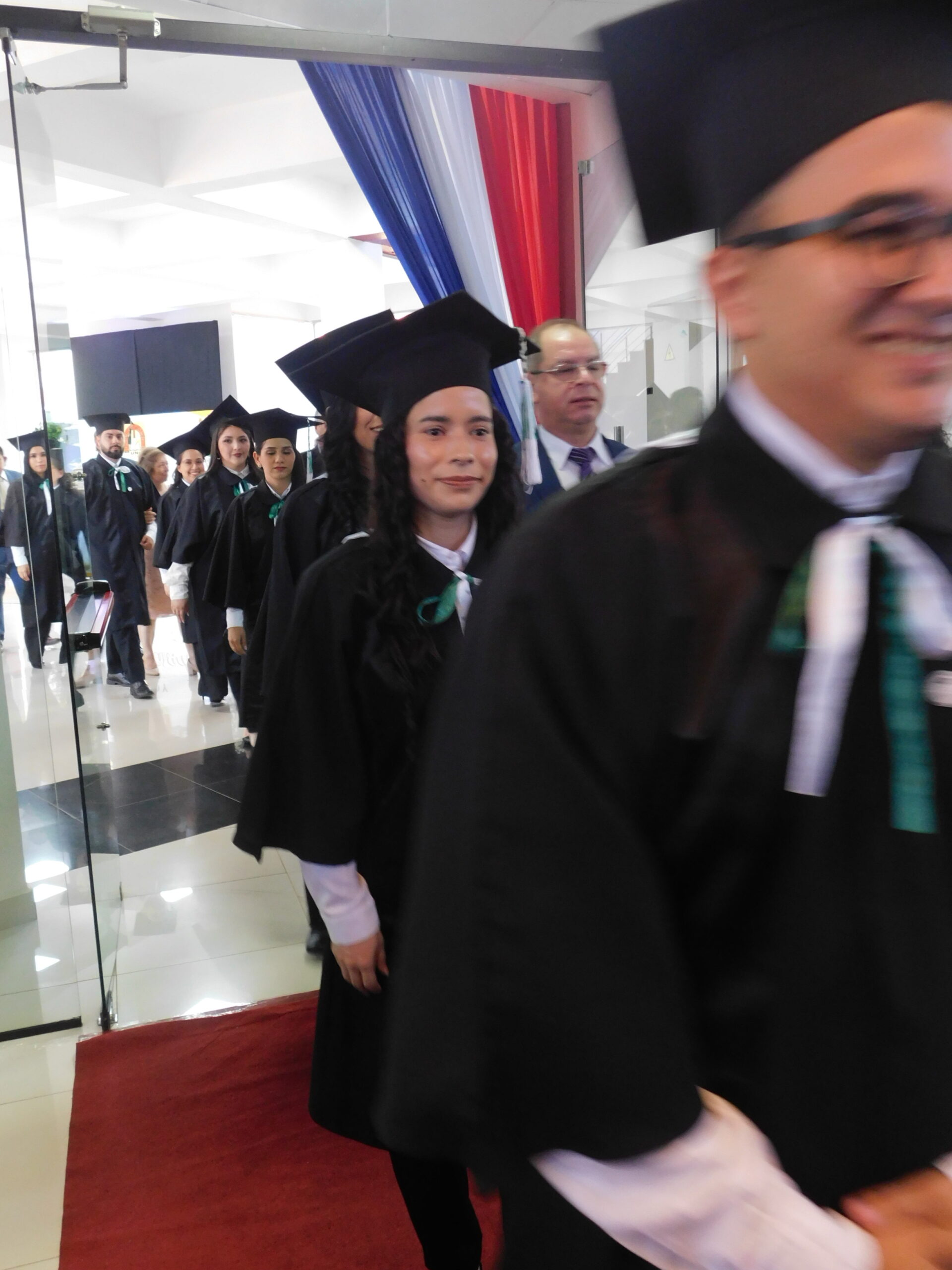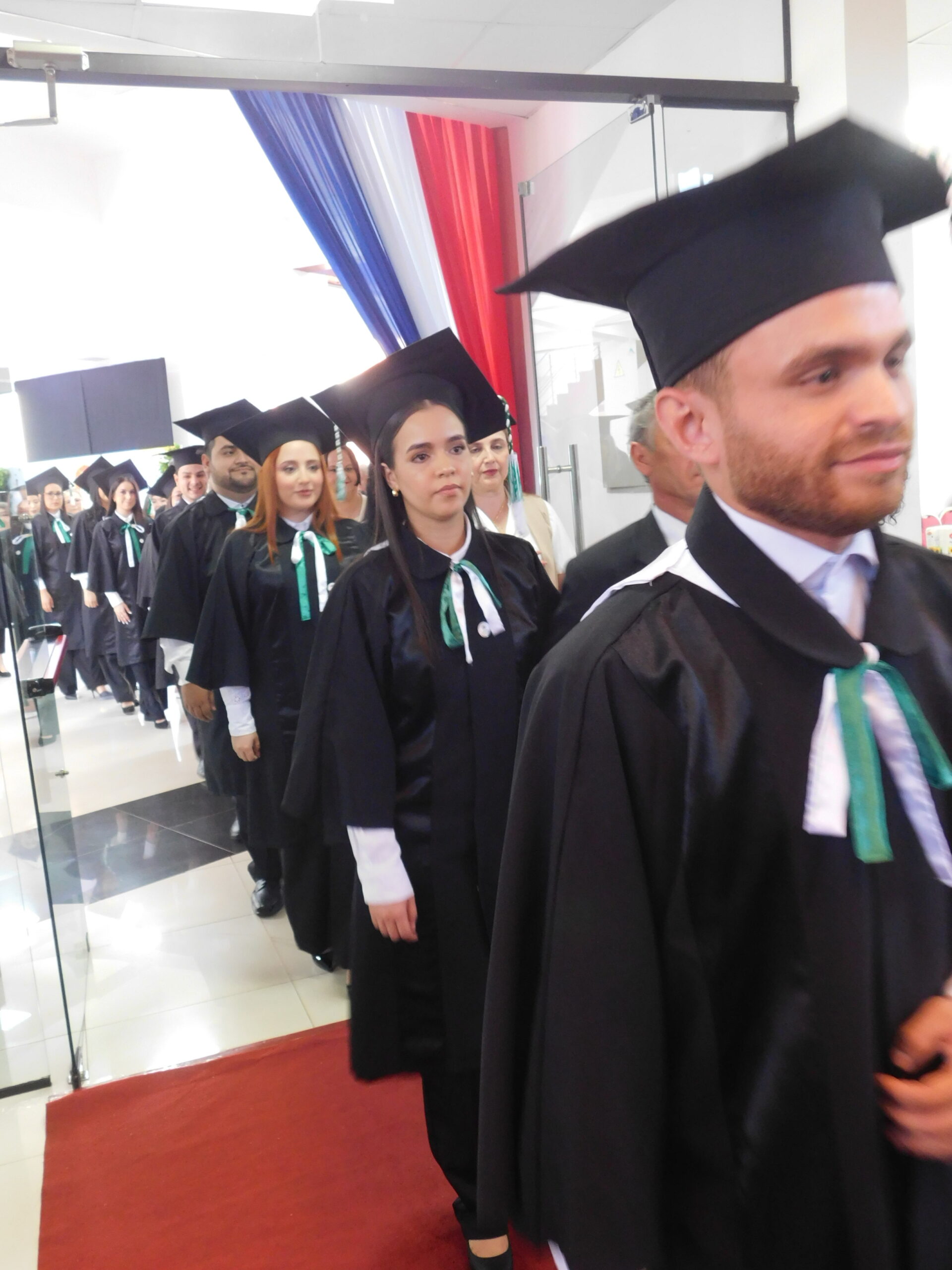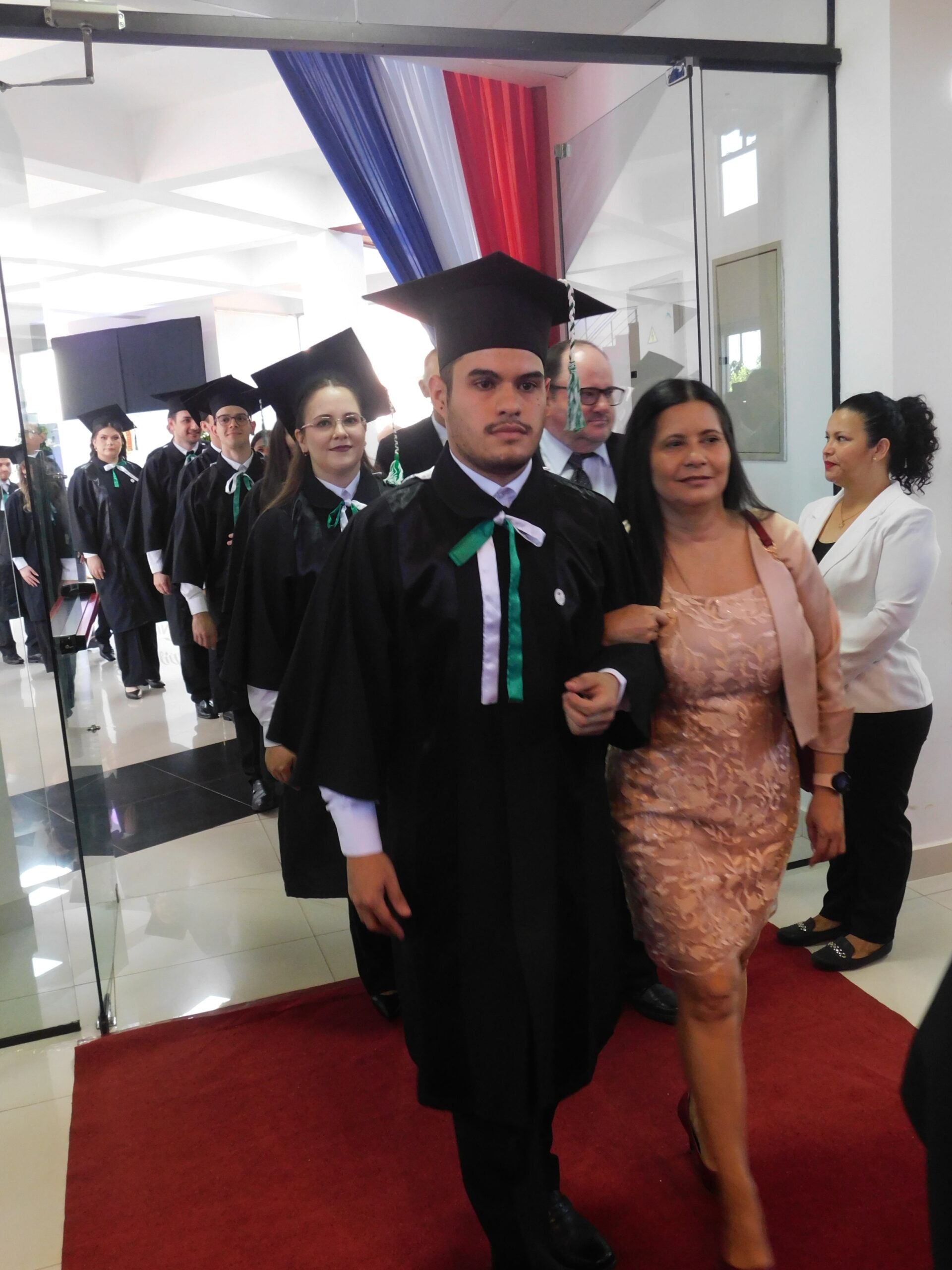A continuación, la ceremonia inició con la Marcha Procesional de ingreso de los graduados junto a sus padrinos. Seguidamente, se entonó el Himno Nacional, marcando el inicio formal del acto académico.