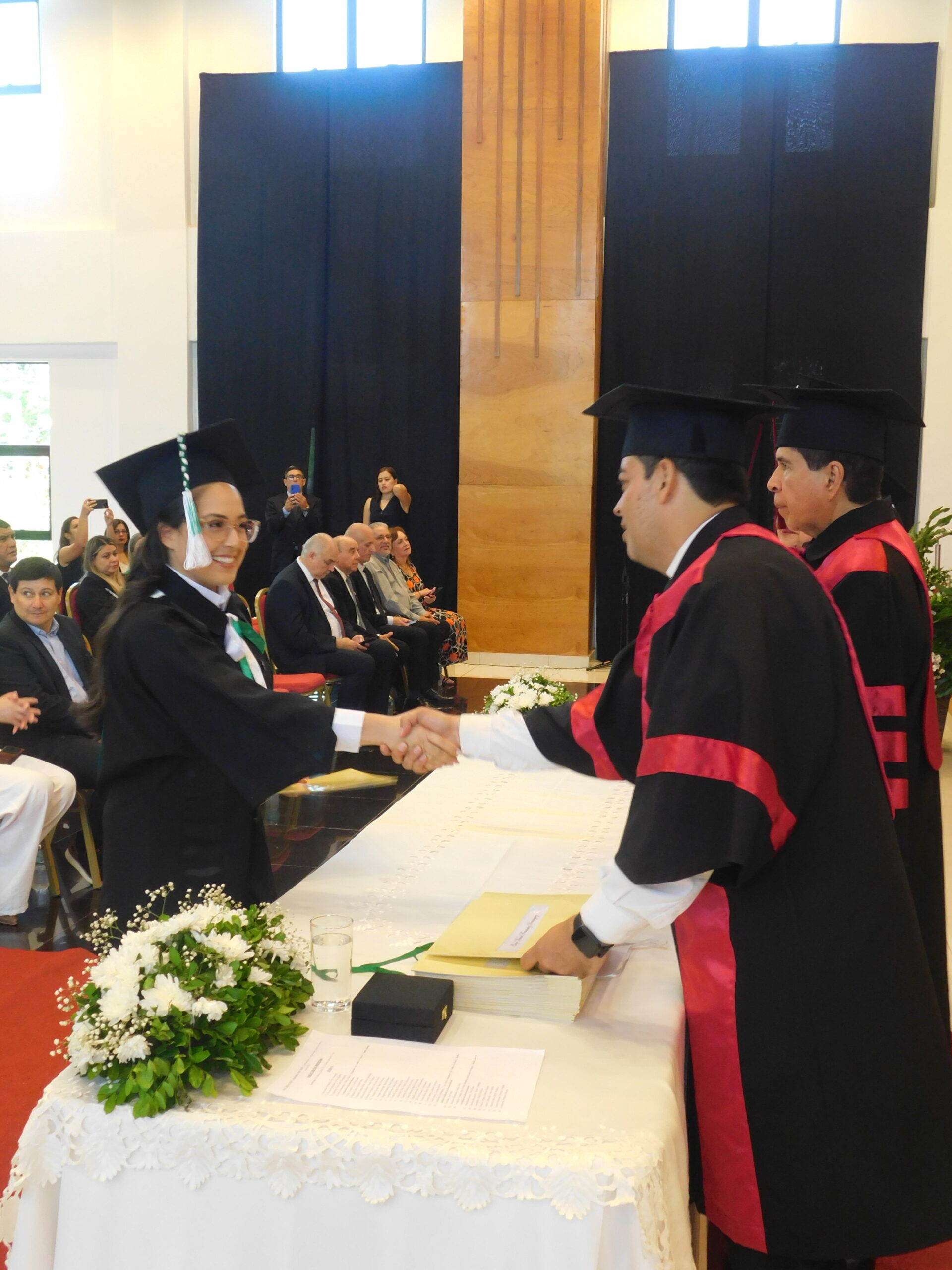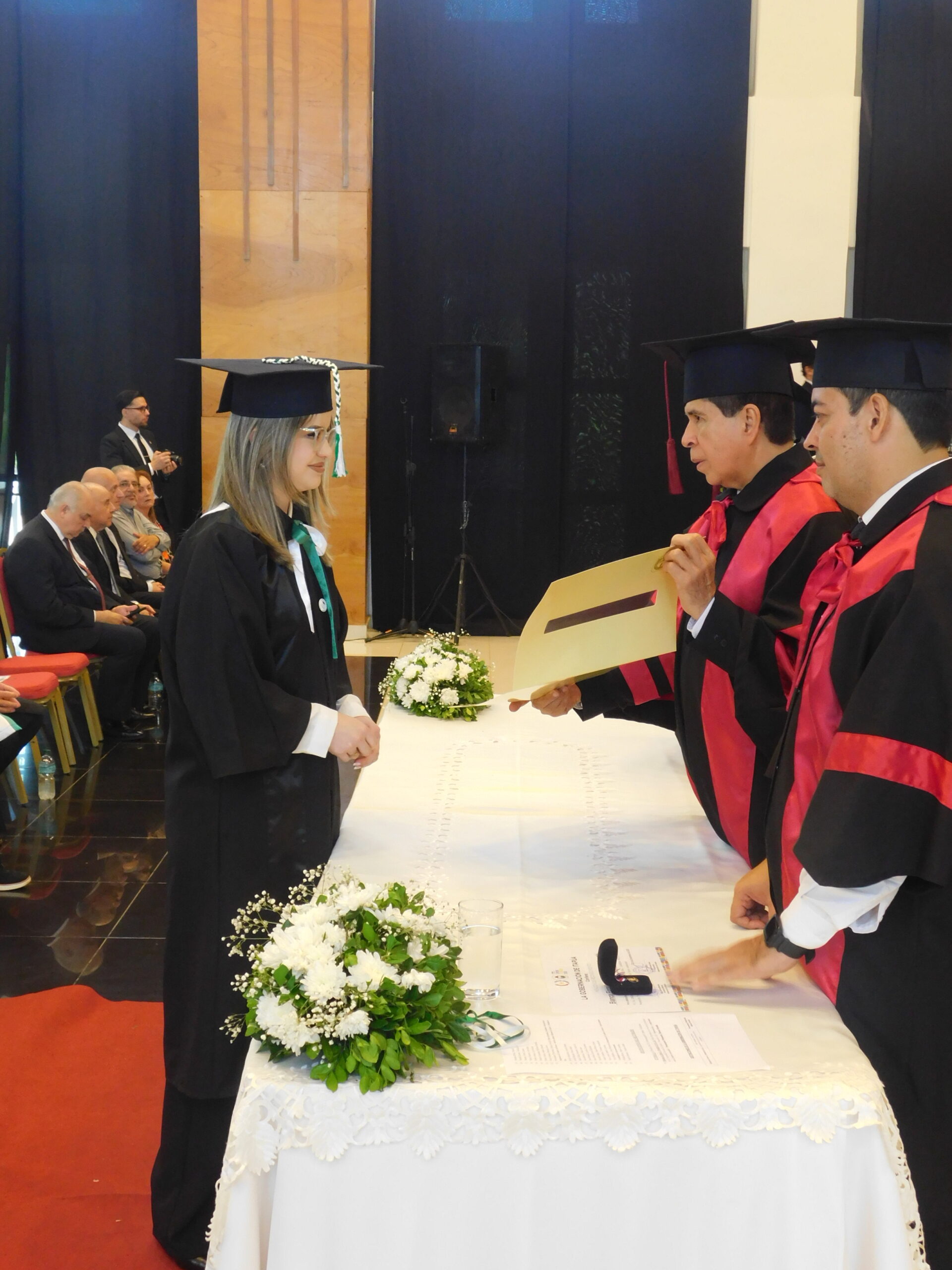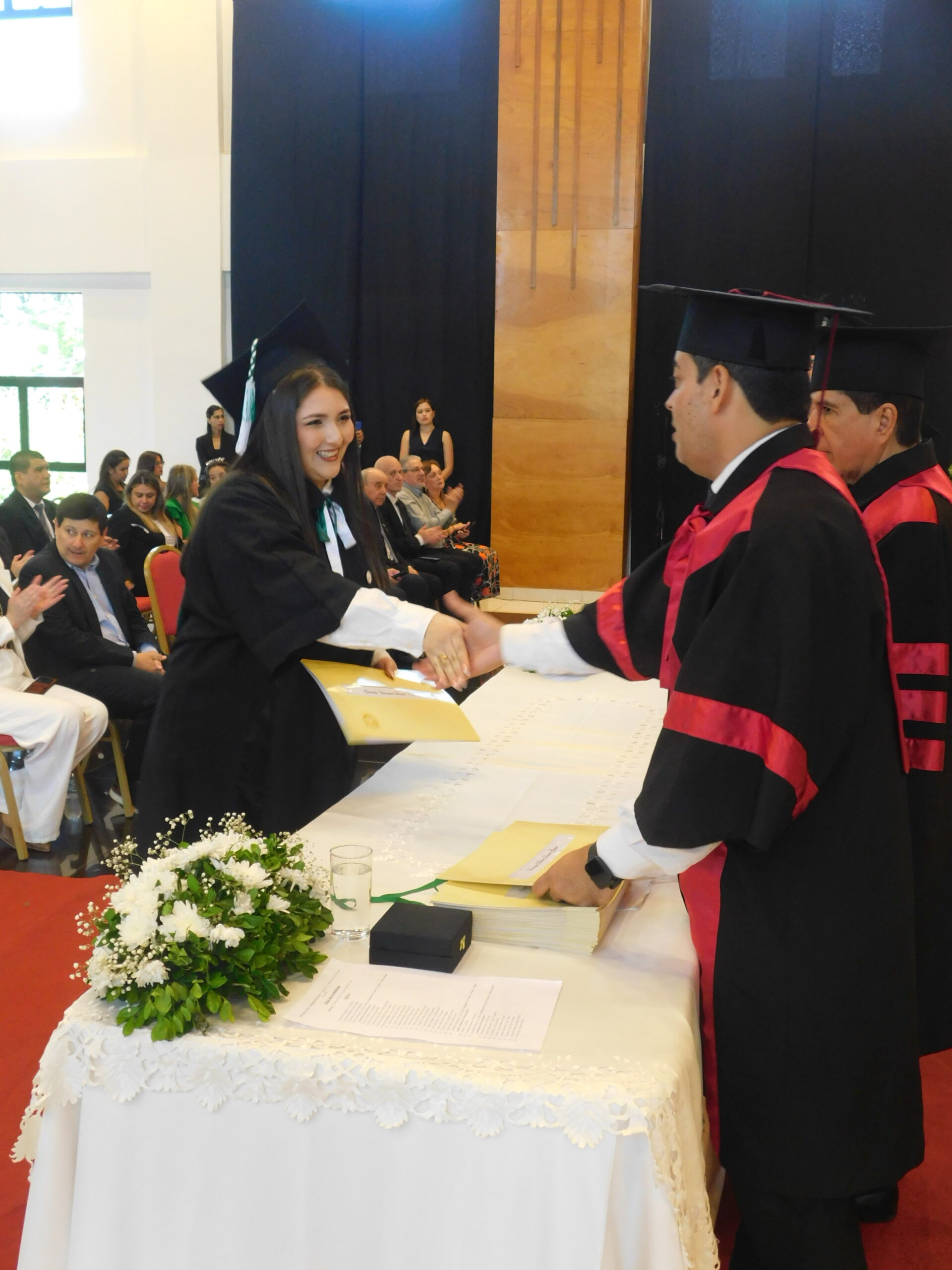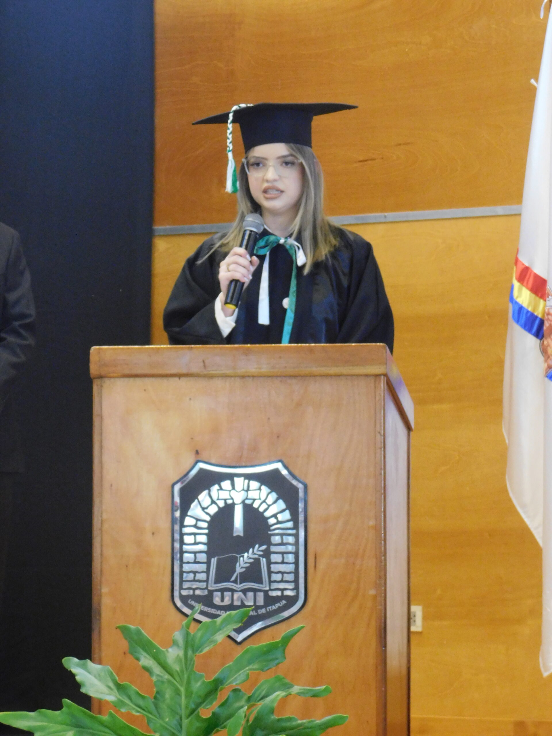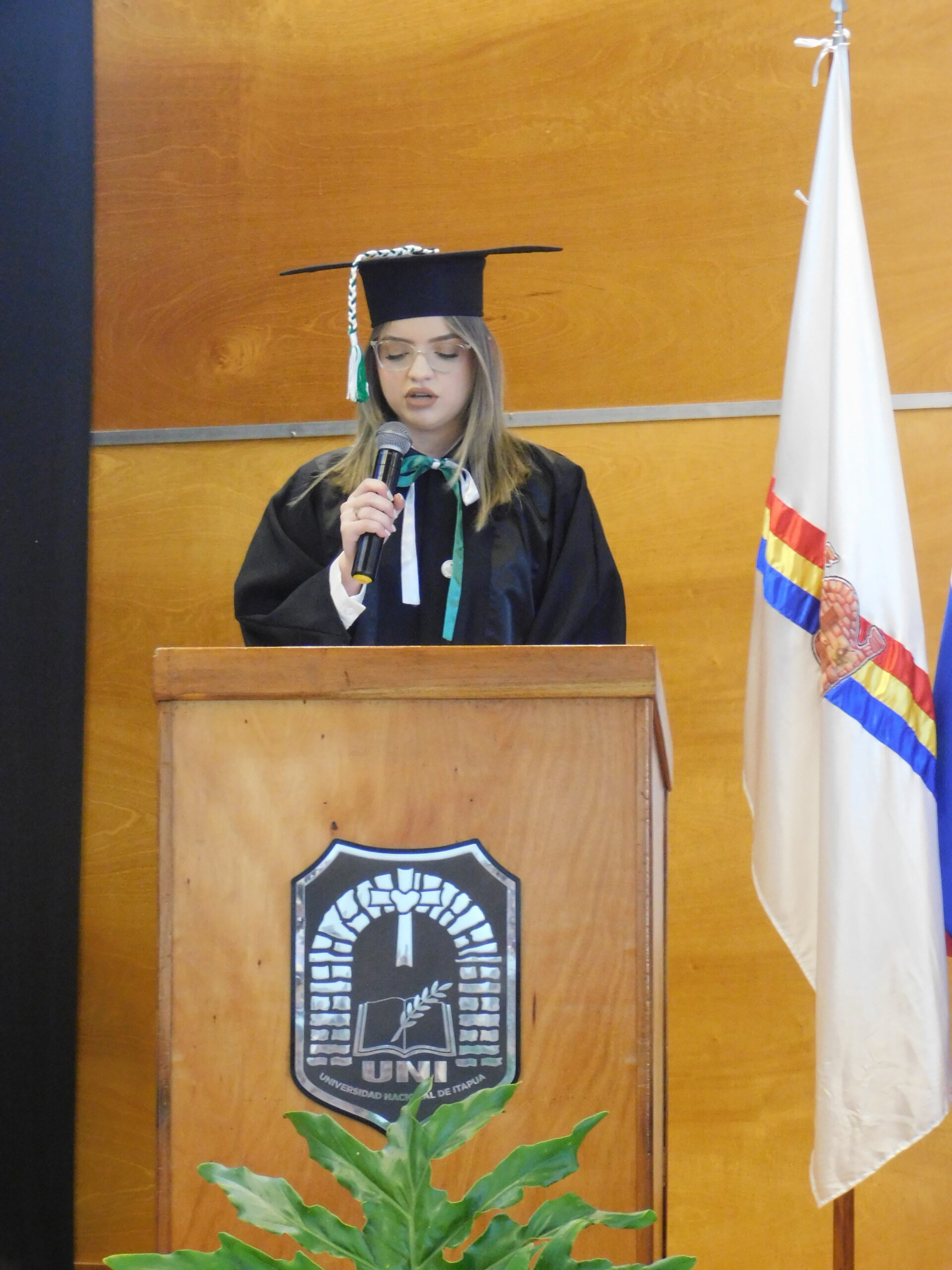 Seguidamente, en representación de sus compañeros, la Mejor Egresada, Bianca Fiorella Provenzano Pinkoski, dirigió unas palabras de agradecimiento. Expresó su profundo reconocimiento a las autoridades universitarias por su compromiso con la formación de profesionales íntegros y por mantener la excelencia académica que distingue a la facultad.