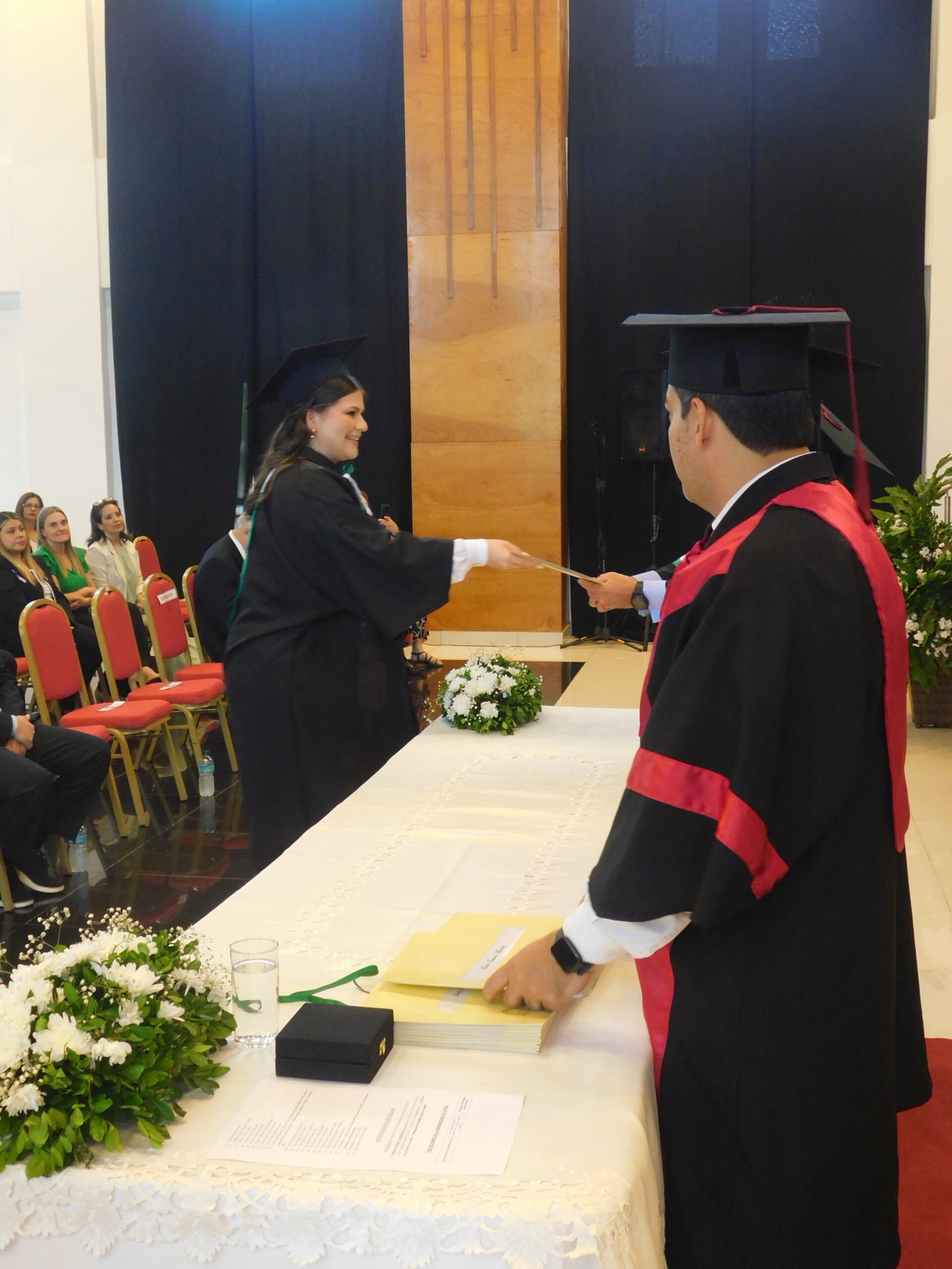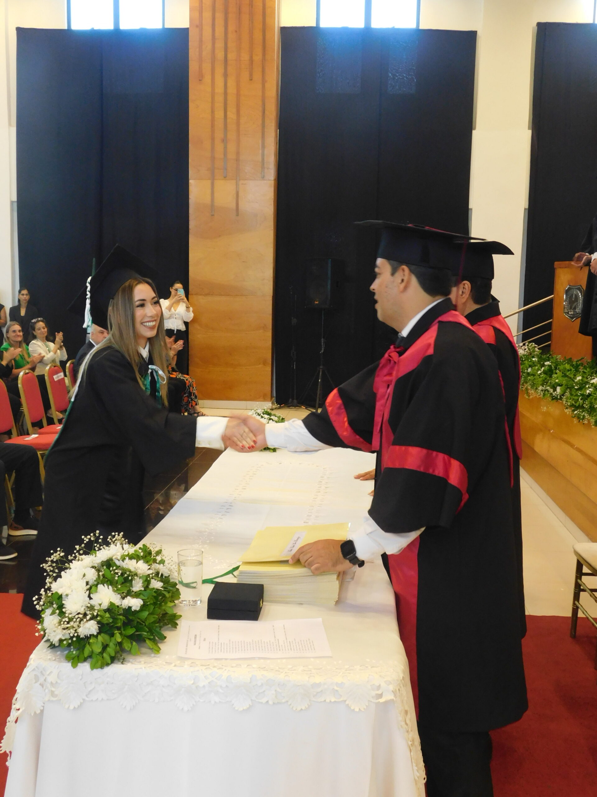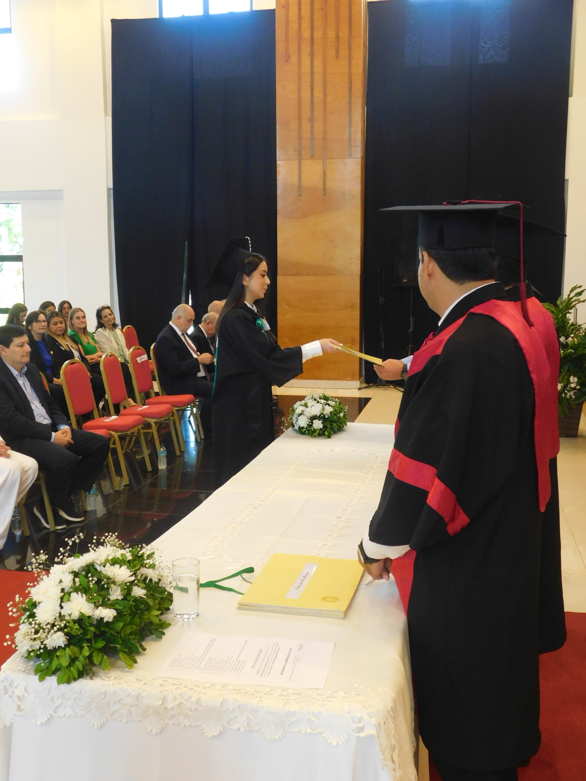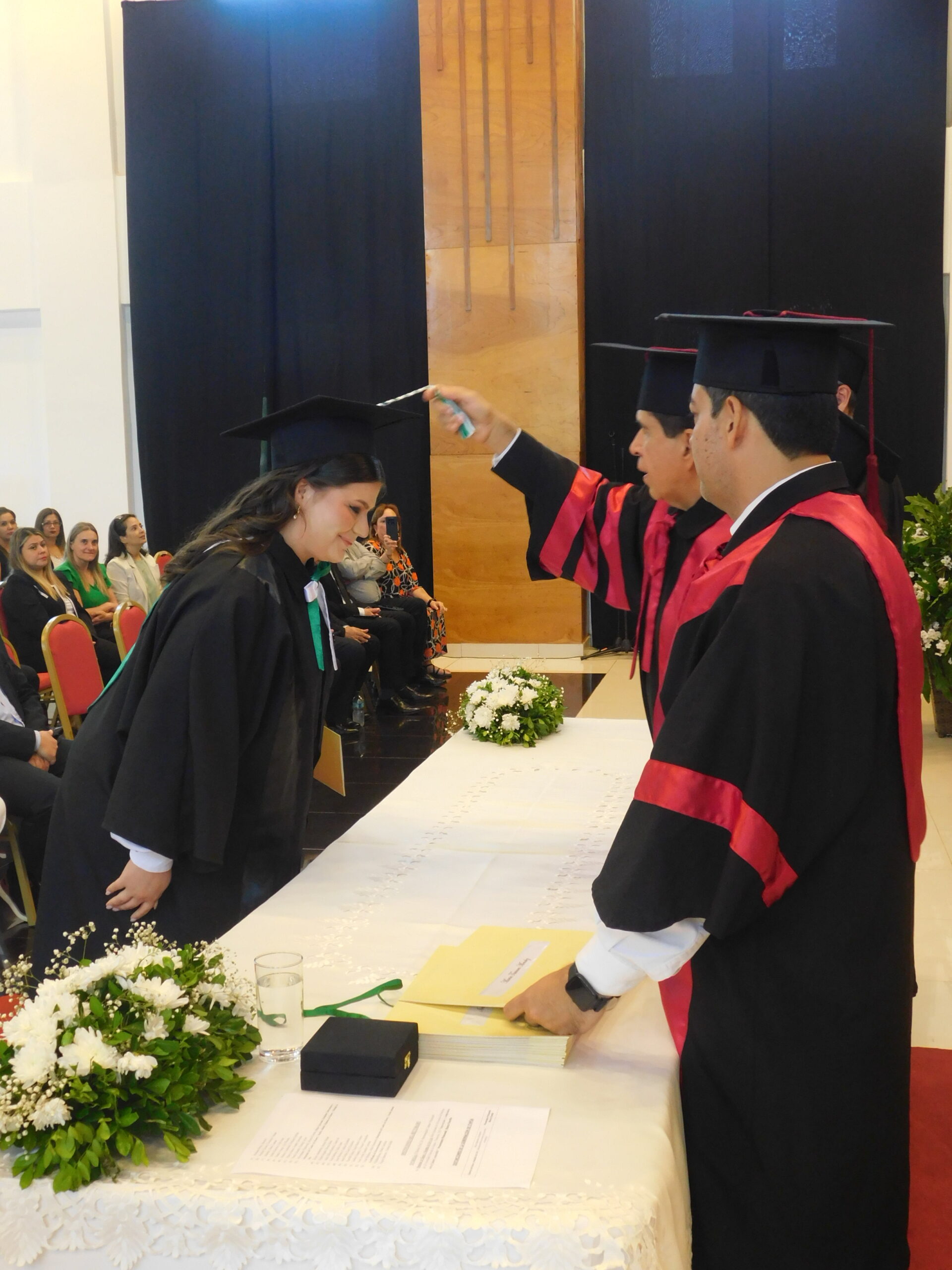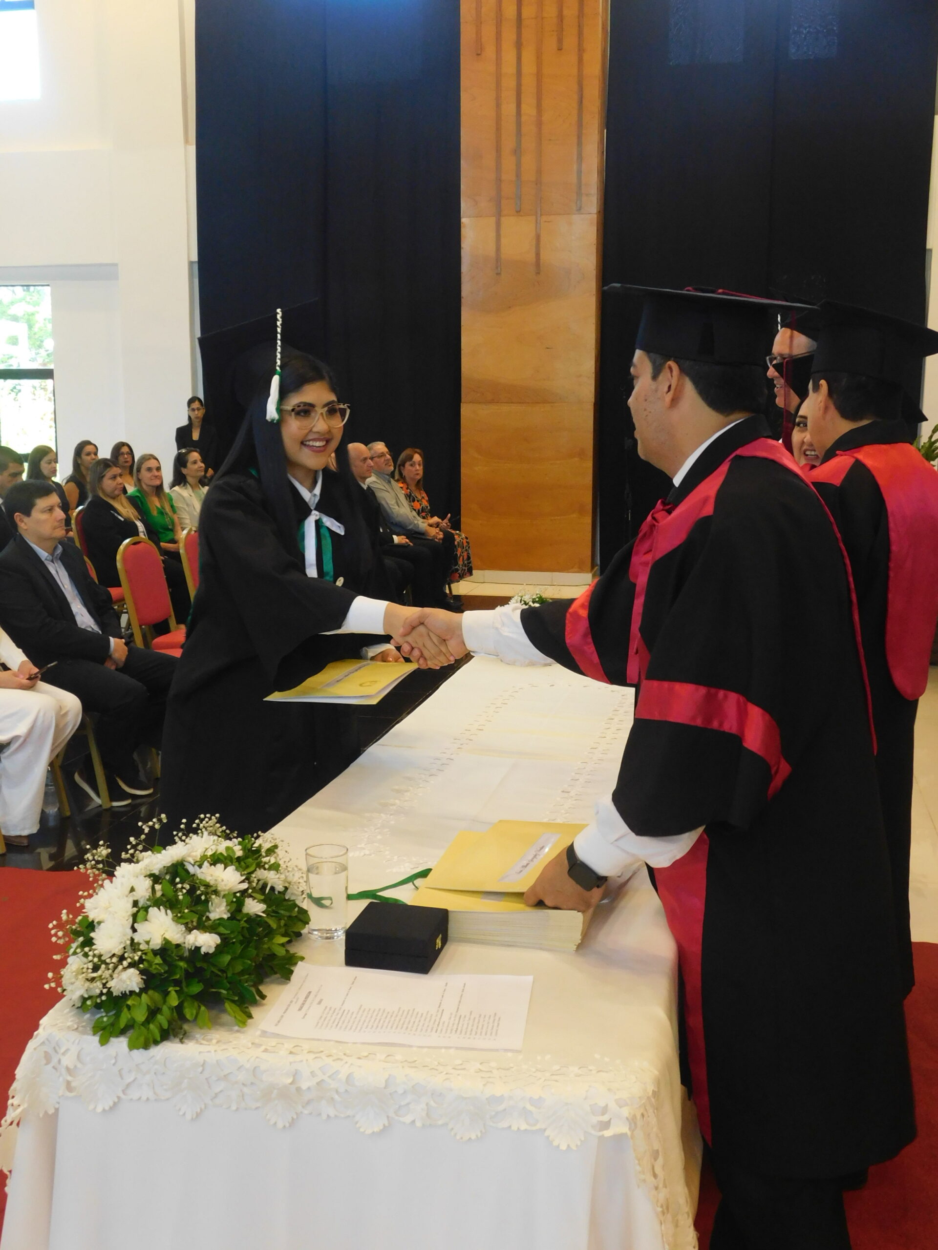 Seguidamente, en representación de sus compañeros, la Mejor Egresada, Bianca Fiorella Provenzano Pinkoski, dirigió unas palabras de agradecimiento. Expresó su profundo reconocimiento a las autoridades universitarias por su compromiso con la formación de profesionales íntegros y por mantener la excelencia académica que distingue a la facultad.