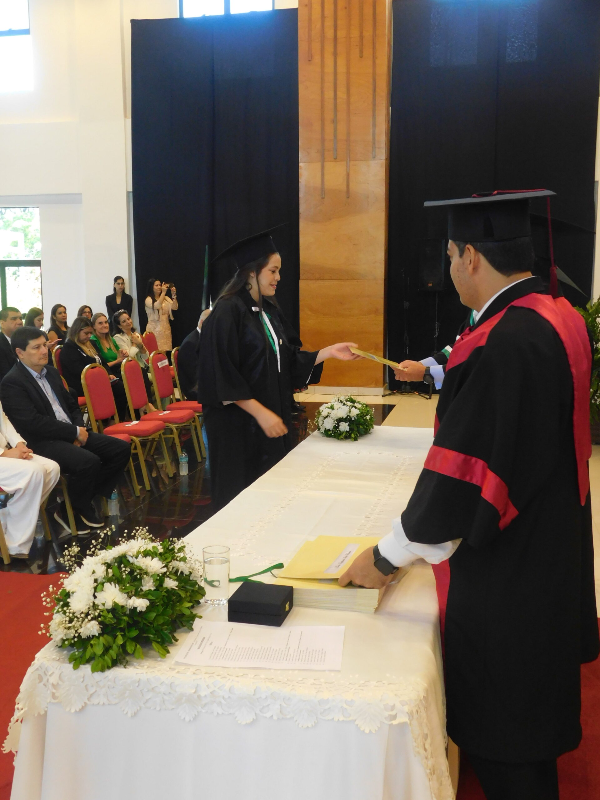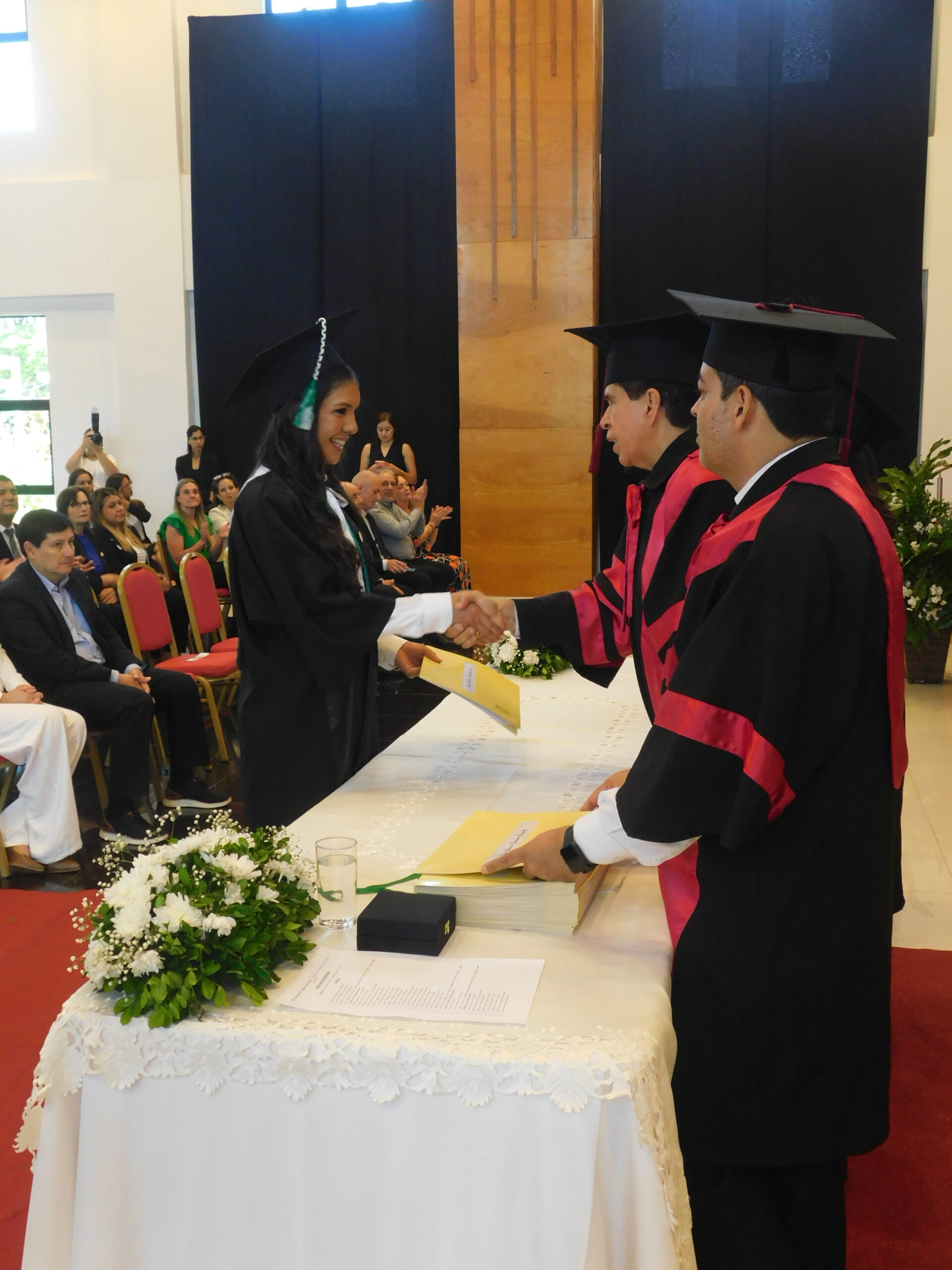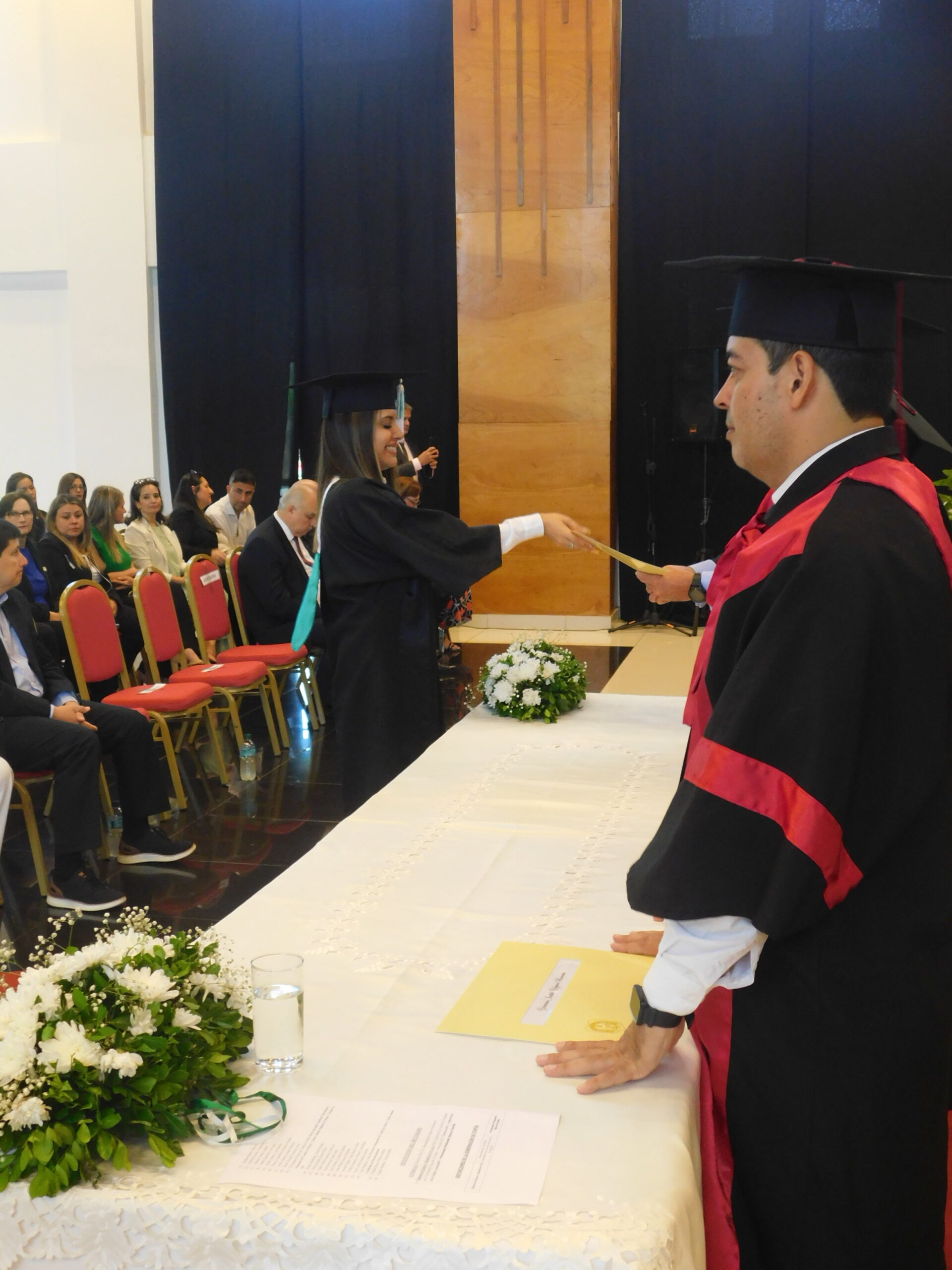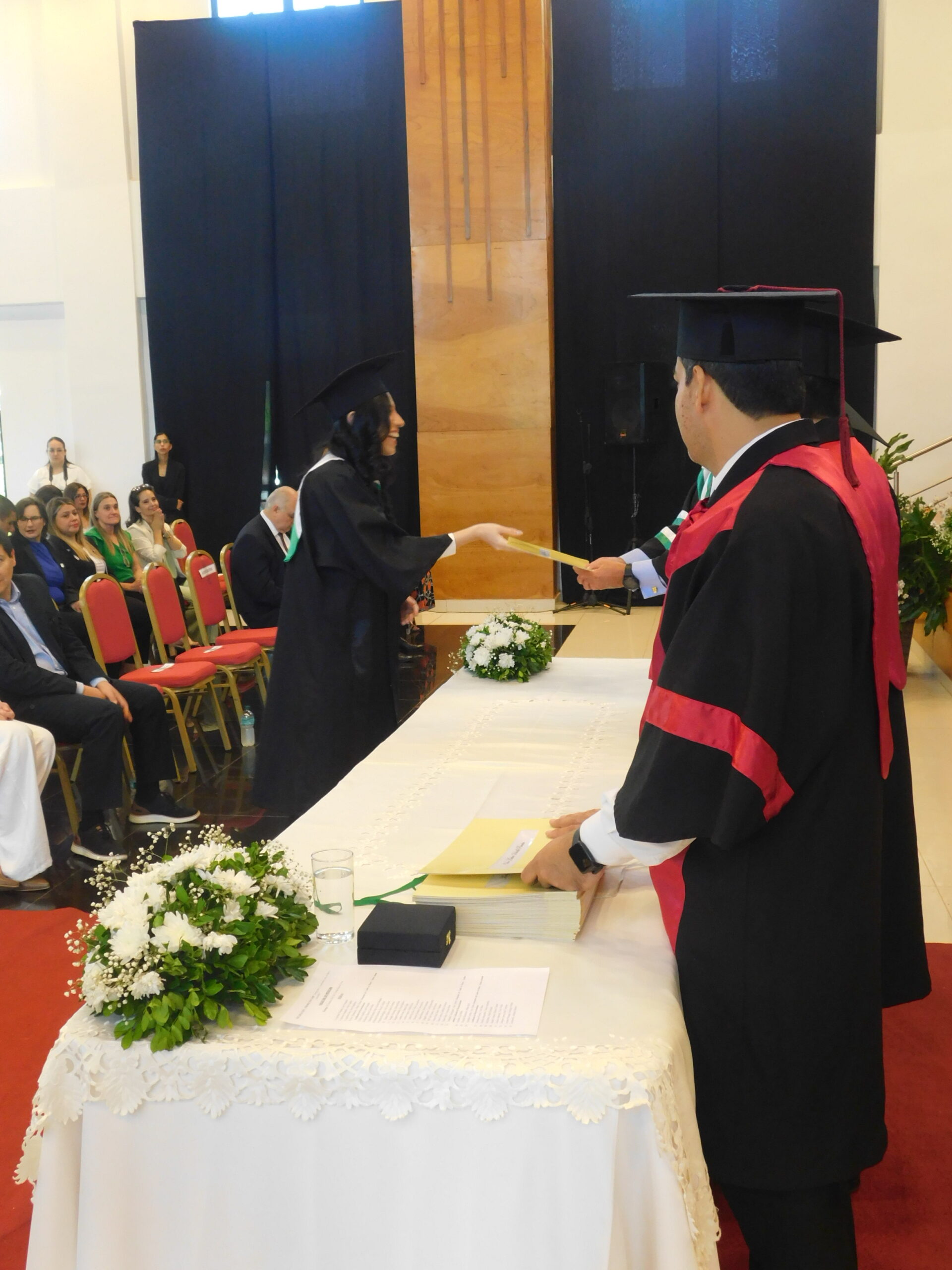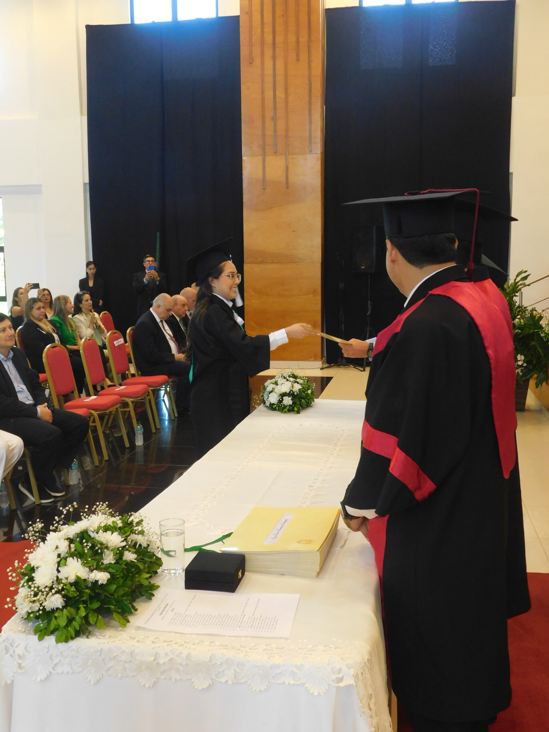 Seguidamente, en representación de sus compañeros, la Mejor Egresada, Bianca Fiorella Provenzano Pinkoski, dirigió unas palabras de agradecimiento. Expresó su profundo reconocimiento a las autoridades universitarias por su compromiso con la formación de profesionales íntegros y por mantener la excelencia académica que distingue a la facultad.