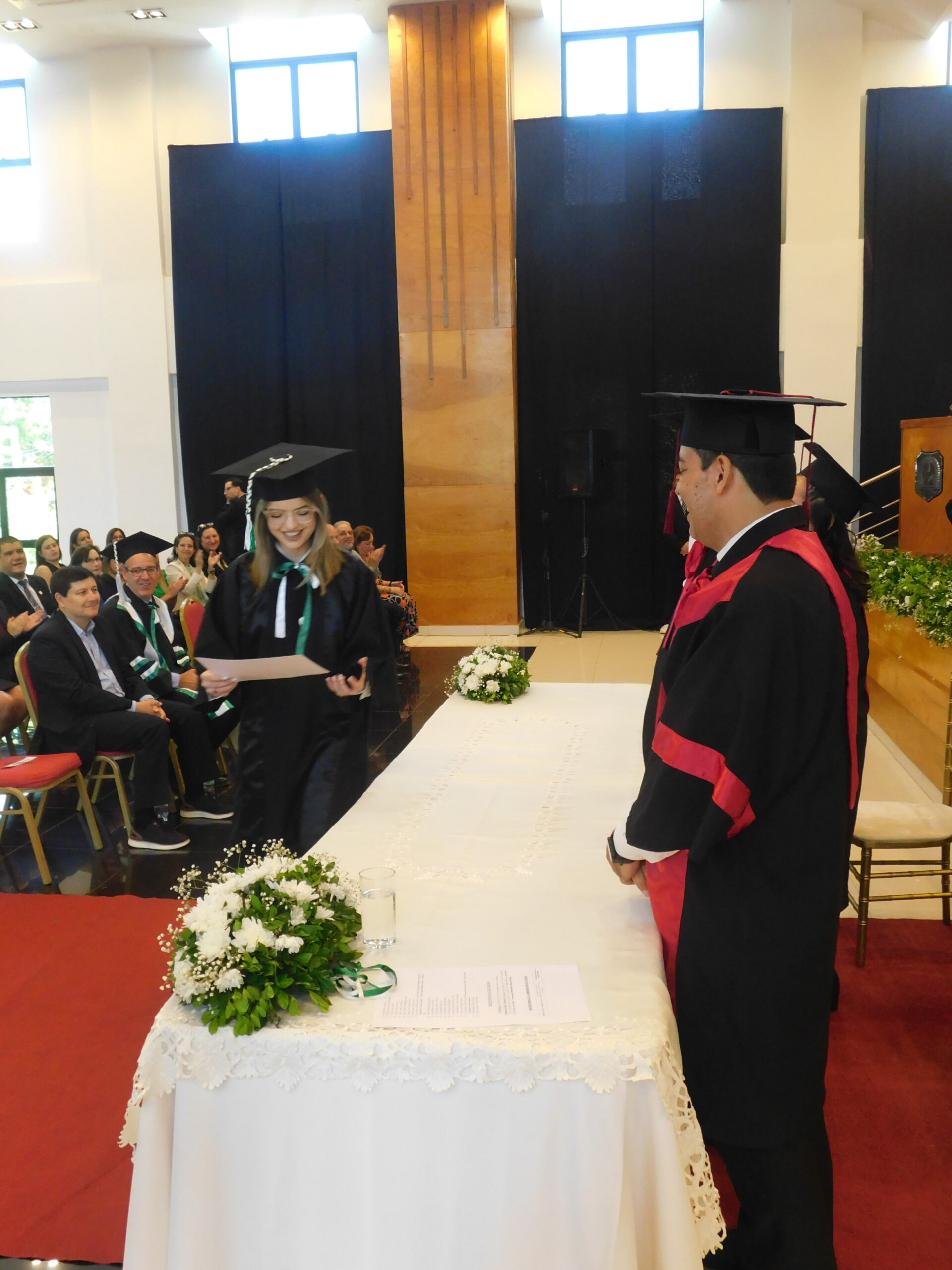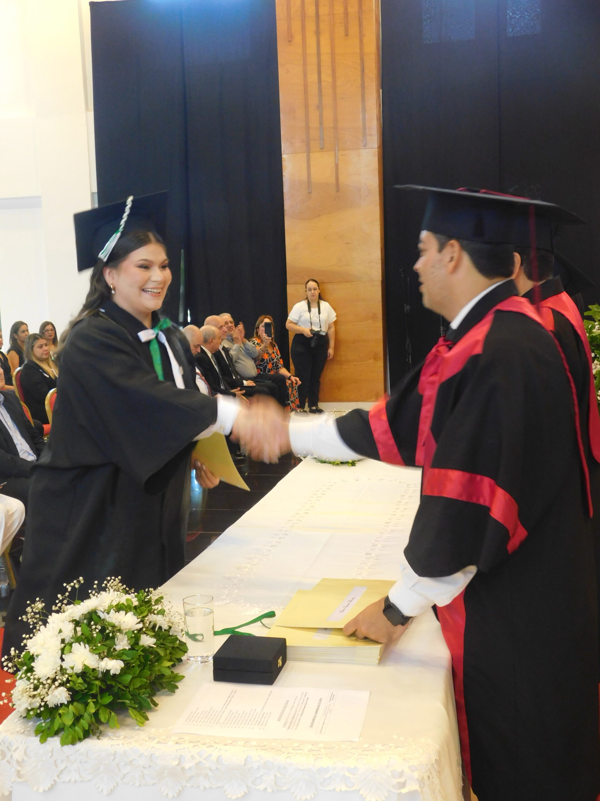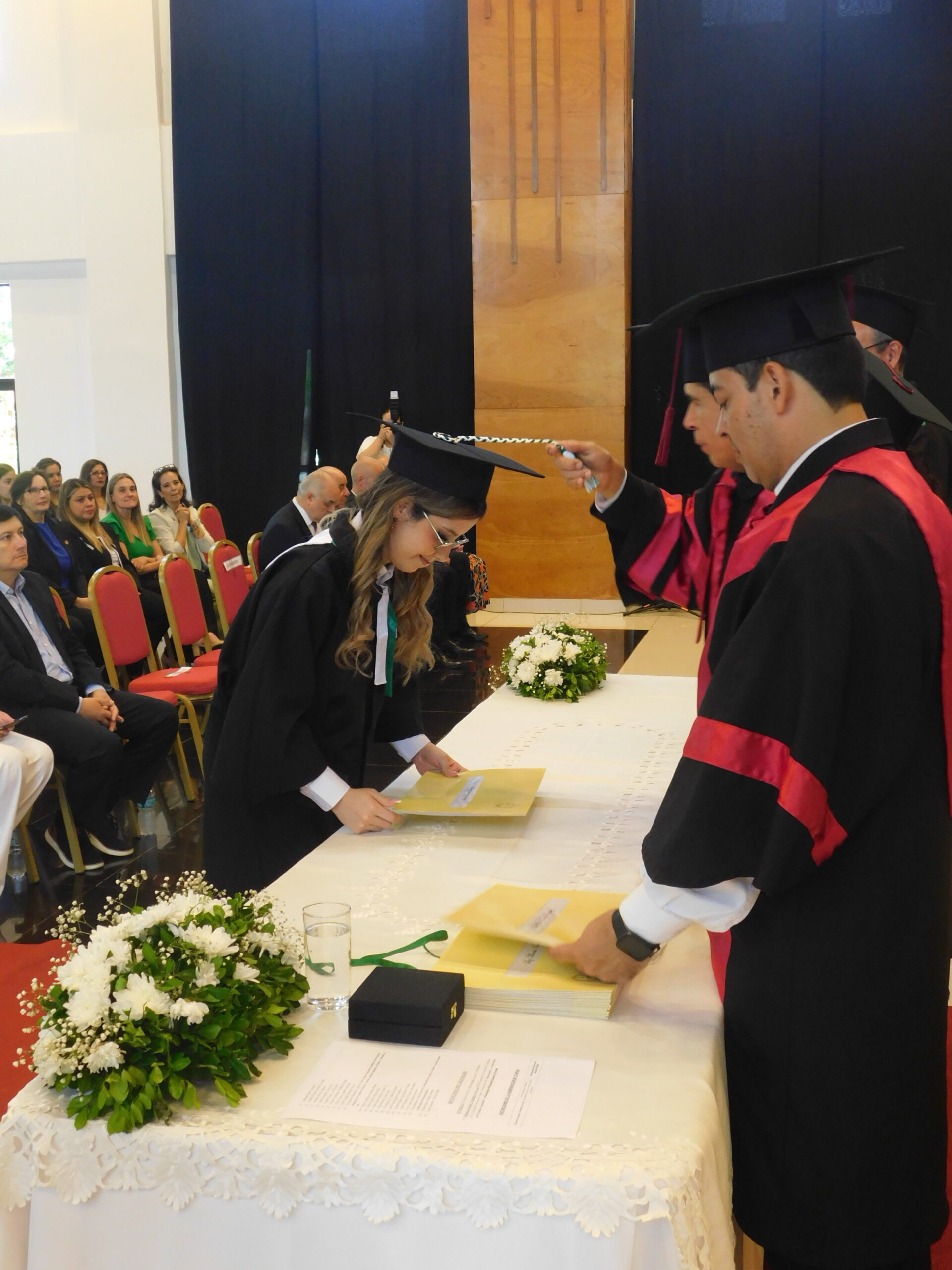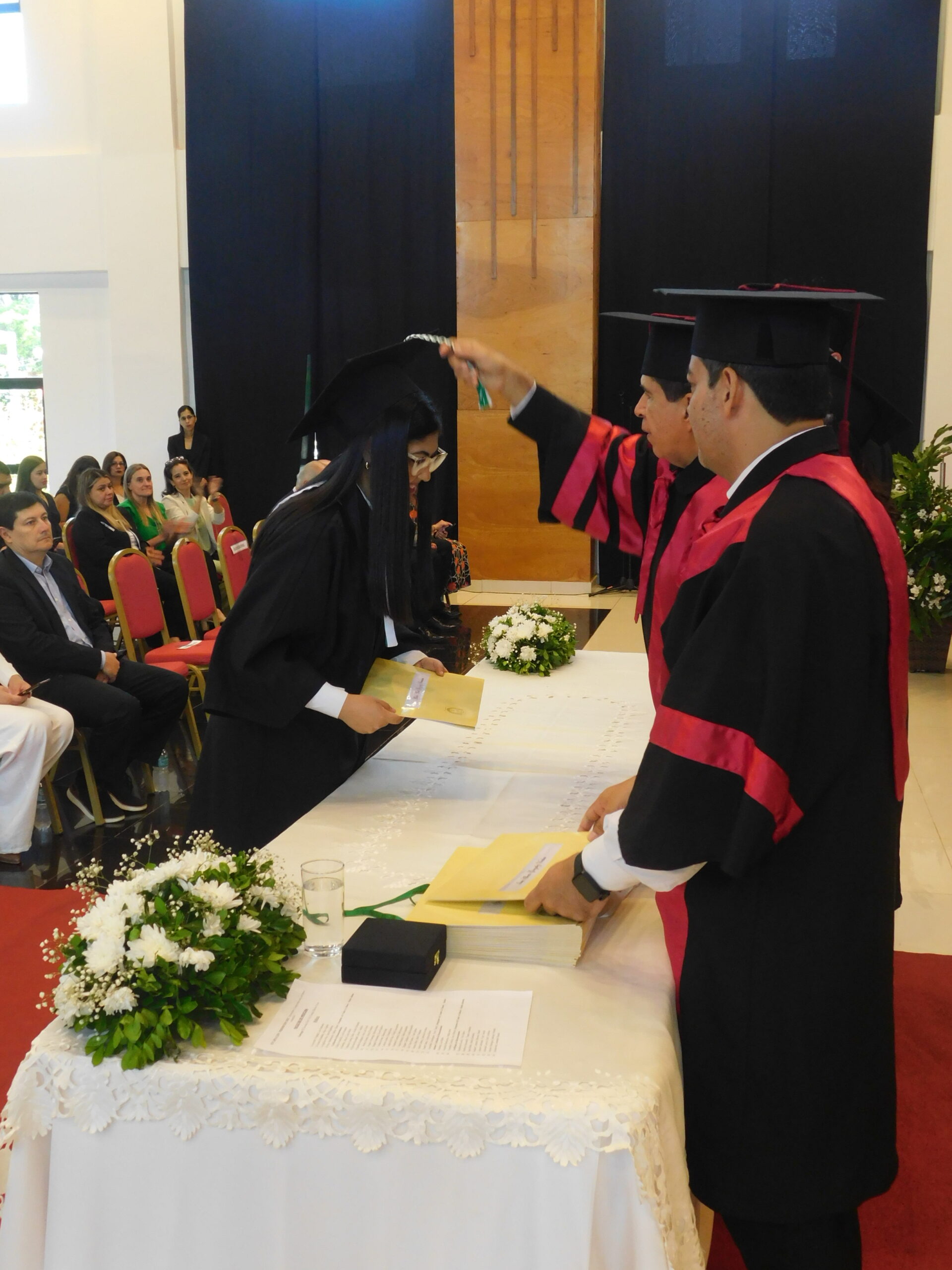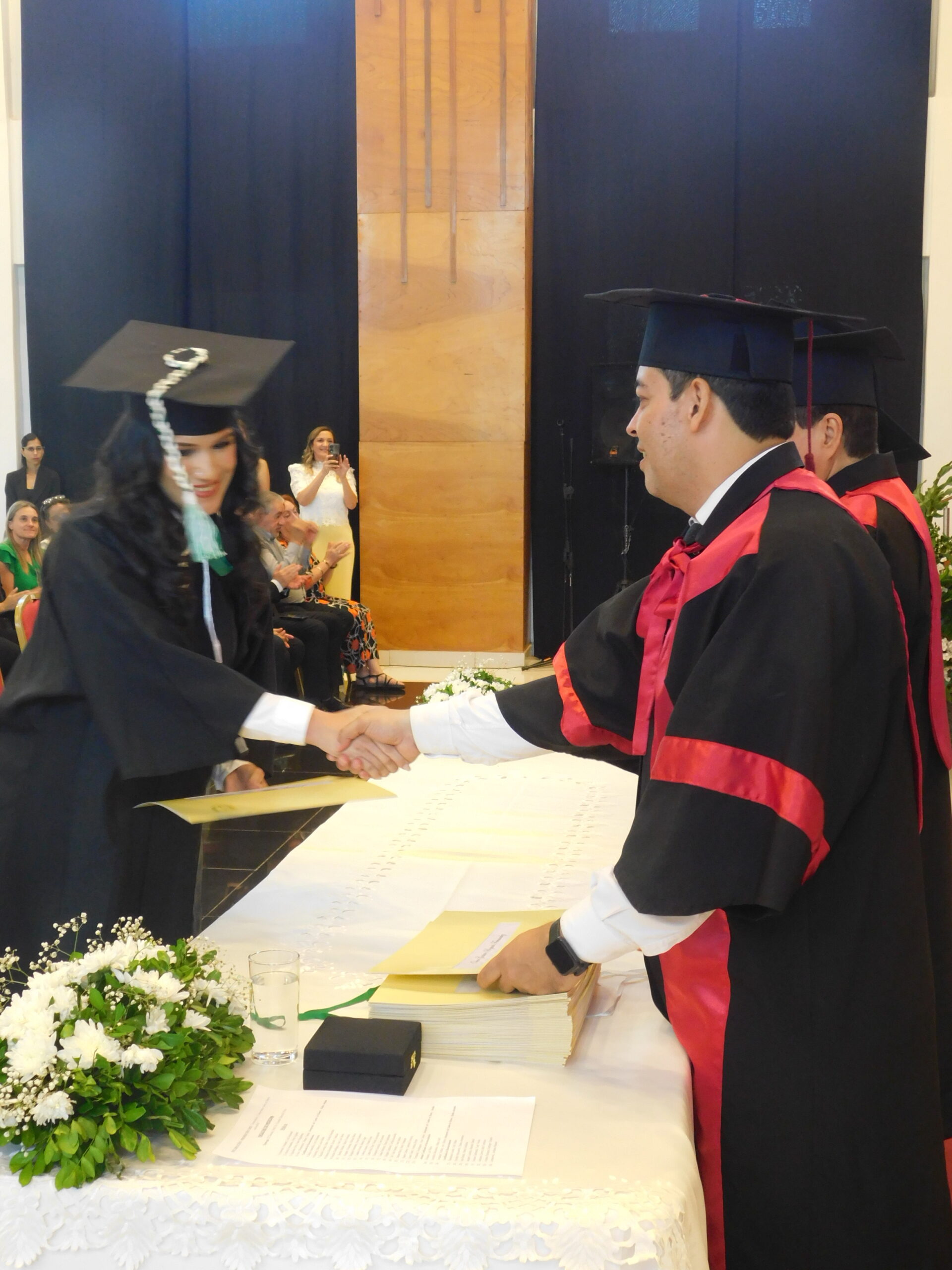 Seguidamente, en representación de sus compañeros, la Mejor Egresada, Bianca Fiorella Provenzano Pinkoski, dirigió unas palabras de agradecimiento. Expresó su profundo reconocimiento a las autoridades universitarias por su compromiso con la formación de profesionales íntegros y por mantener la excelencia académica que distingue a la facultad.