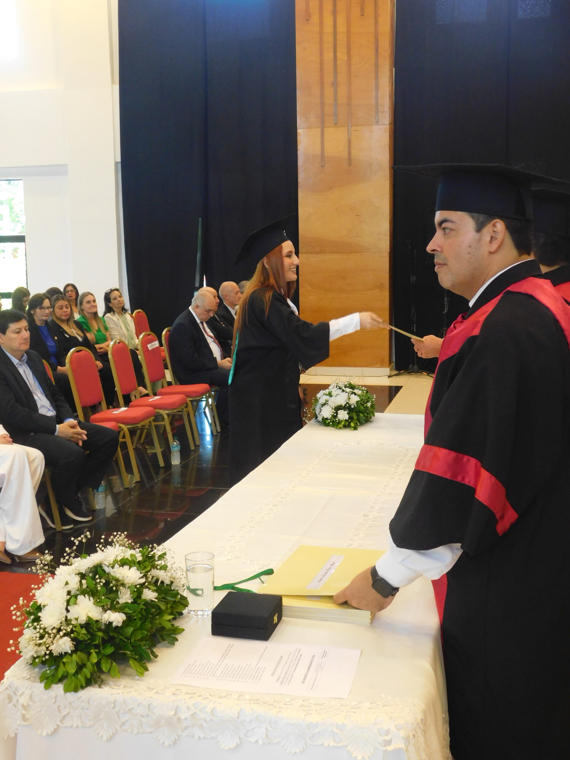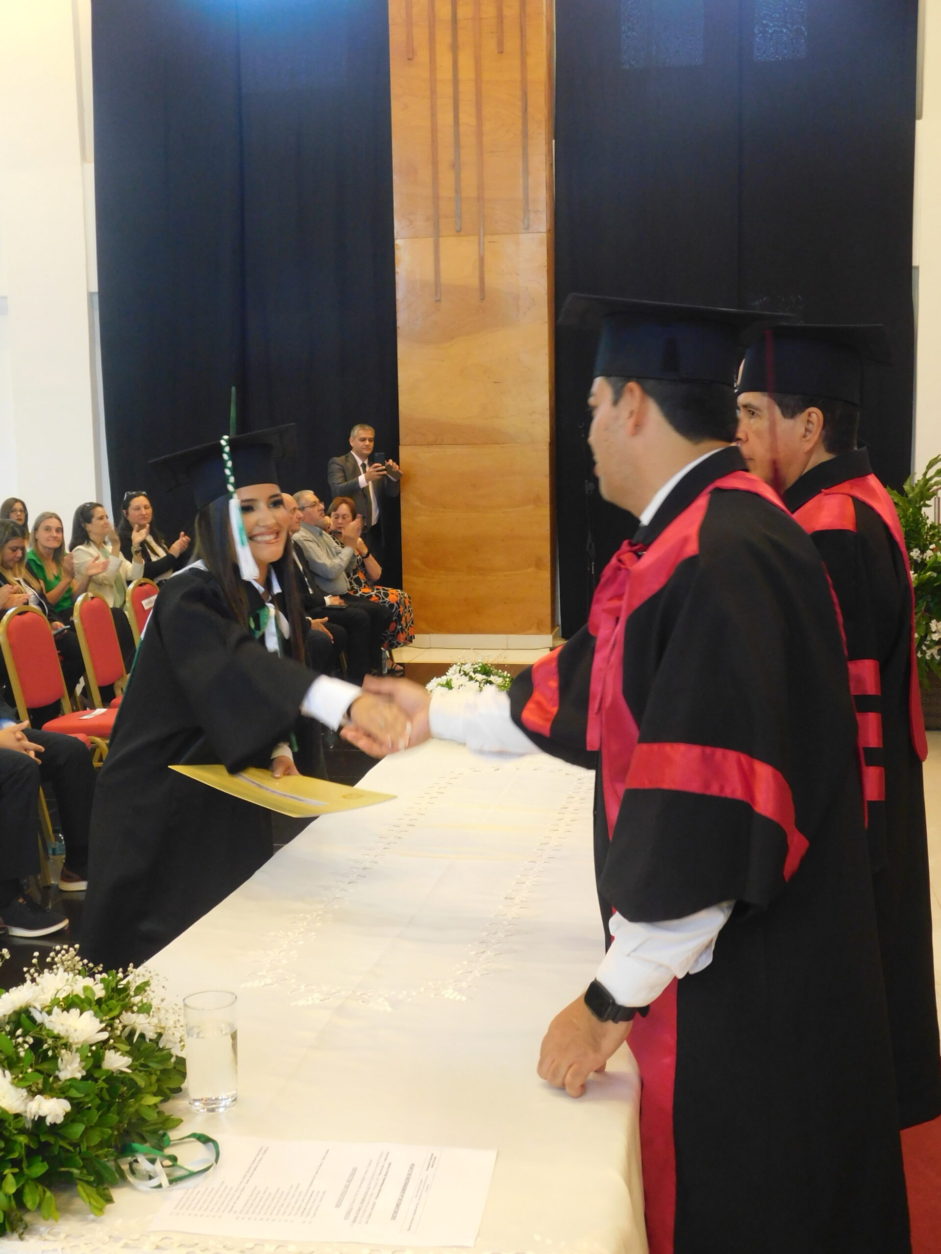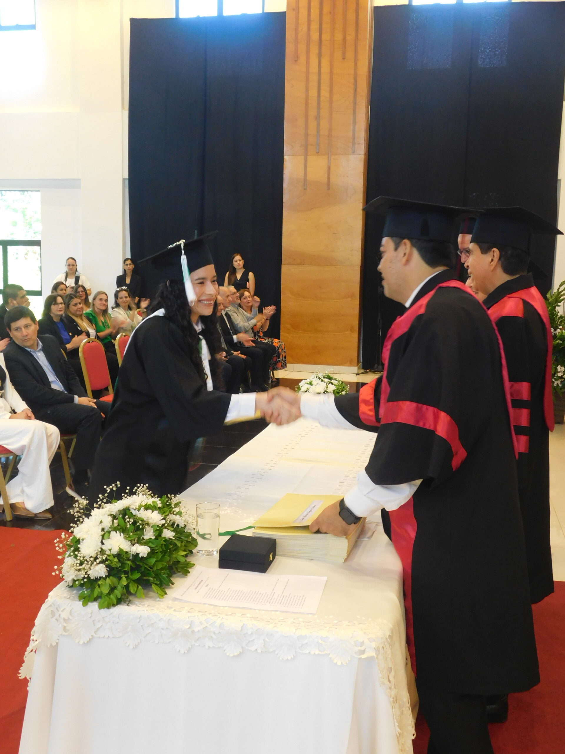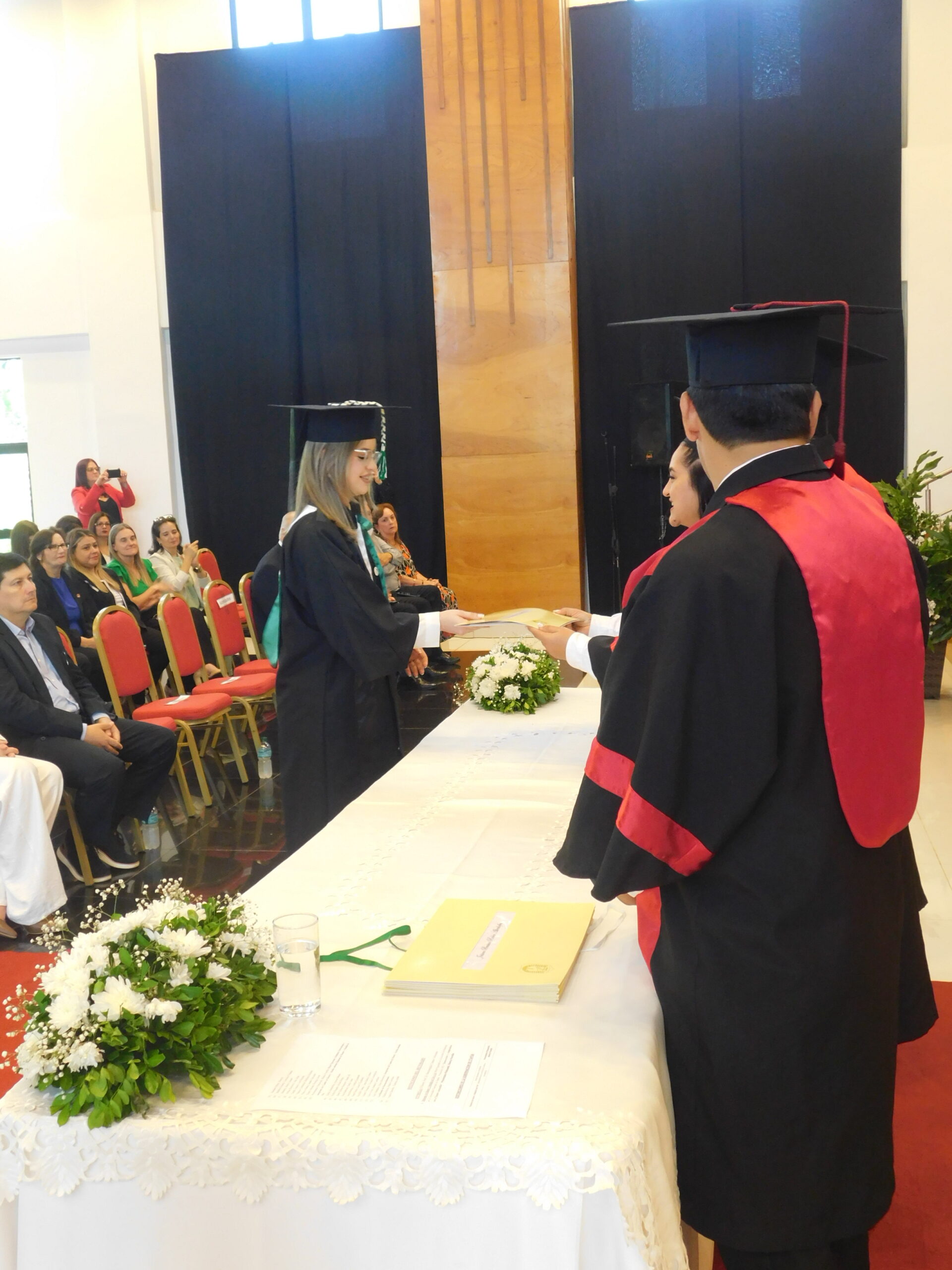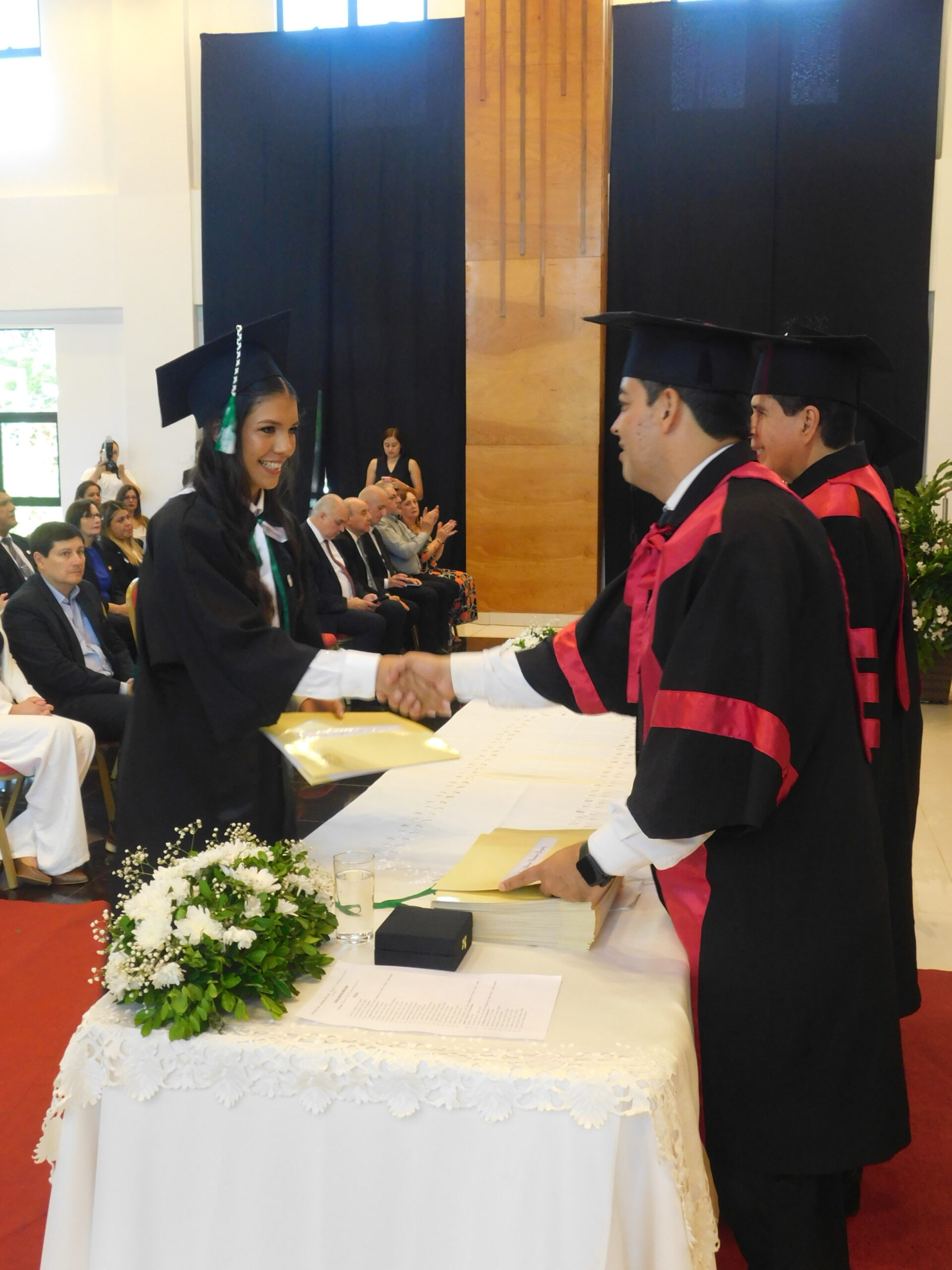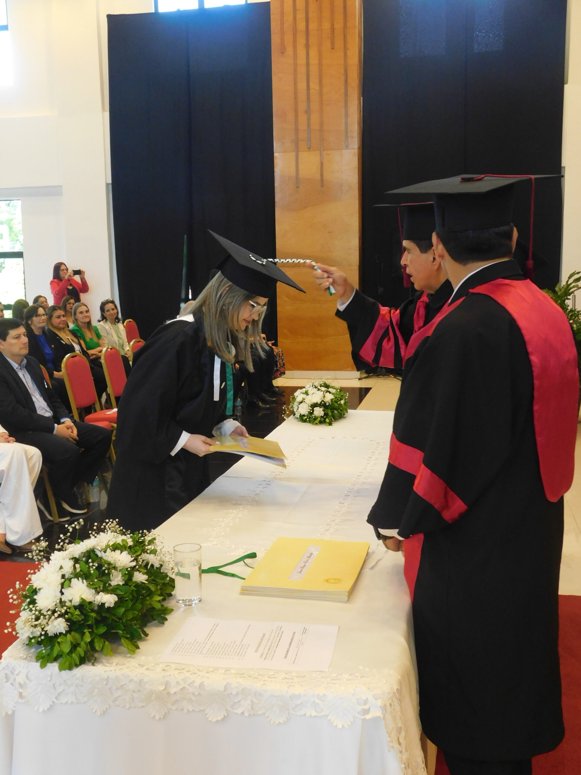 Seguidamente, en representación de sus compañeros, la Mejor Egresada, Bianca Fiorella Provenzano Pinkoski, dirigió unas palabras de agradecimiento. Expresó su profundo reconocimiento a las autoridades universitarias por su compromiso con la formación de profesionales íntegros y por mantener la excelencia académica que distingue a la facultad.