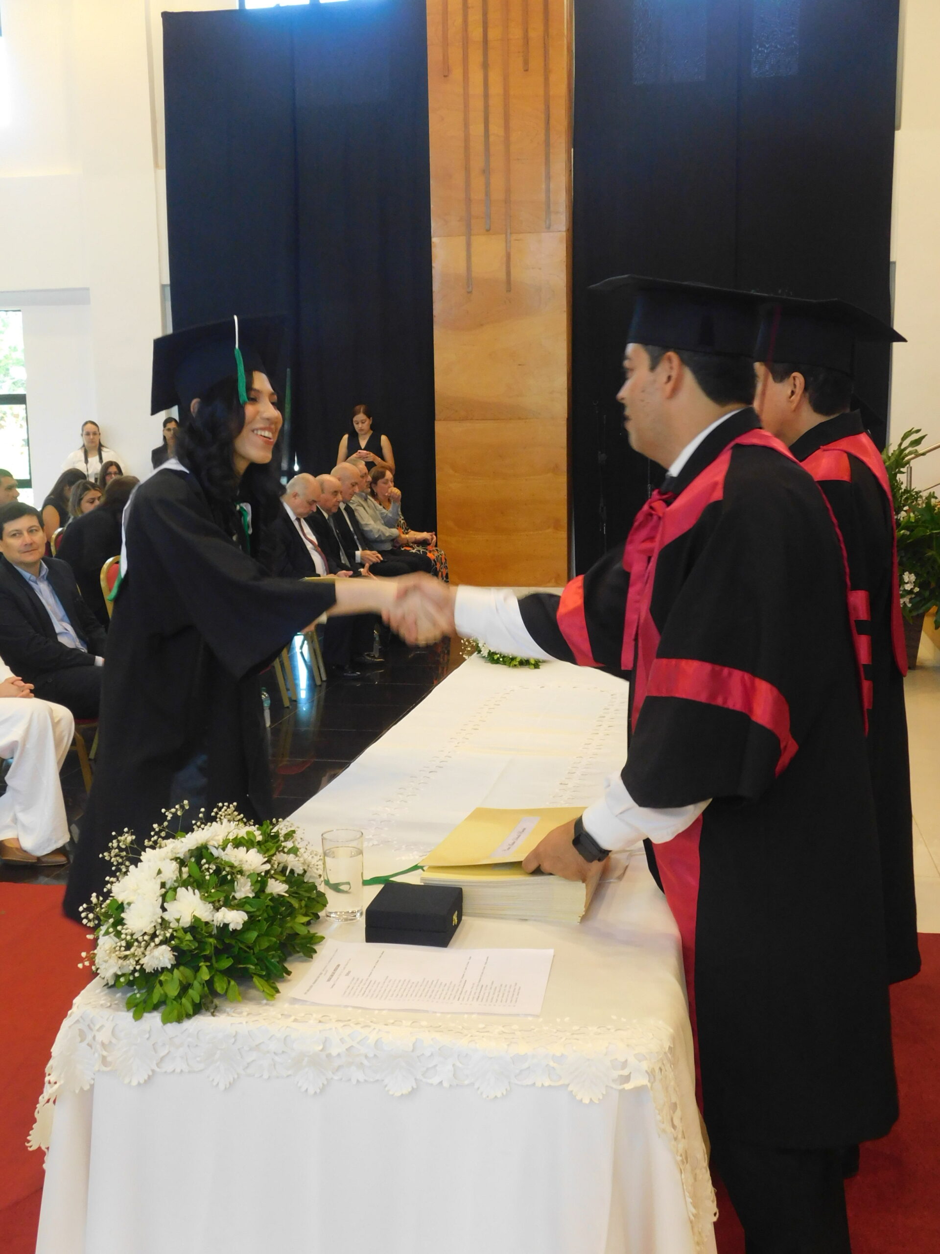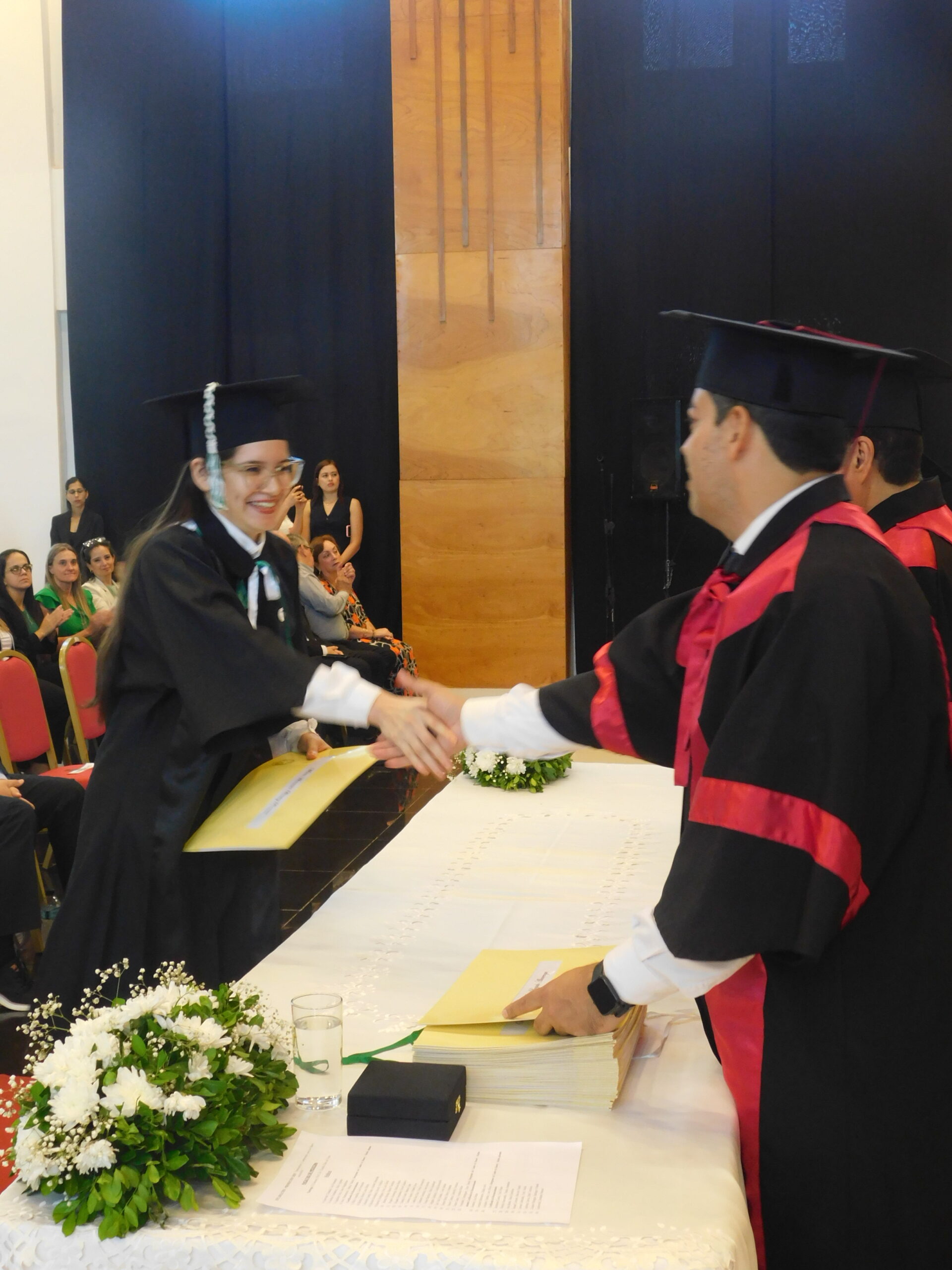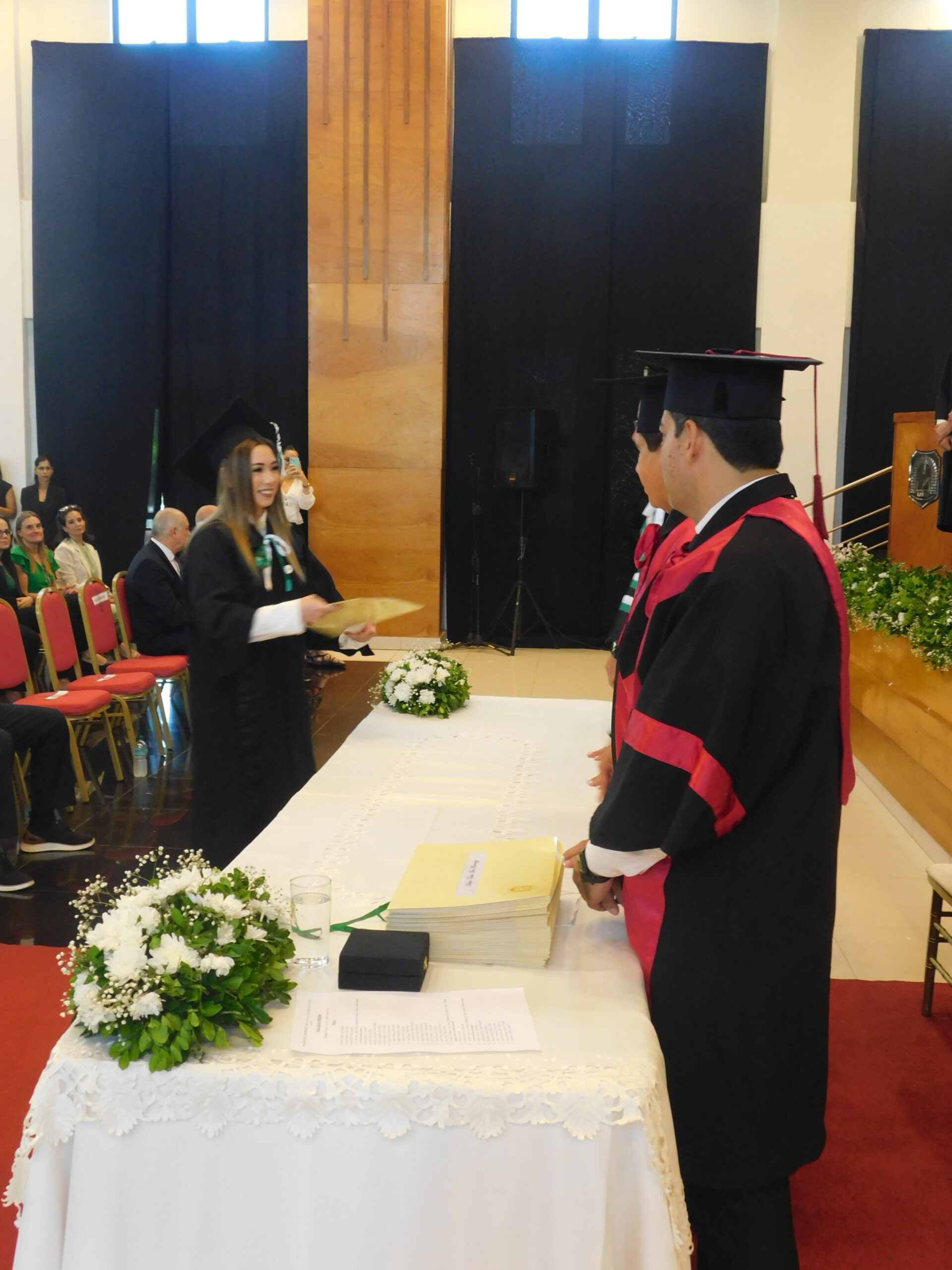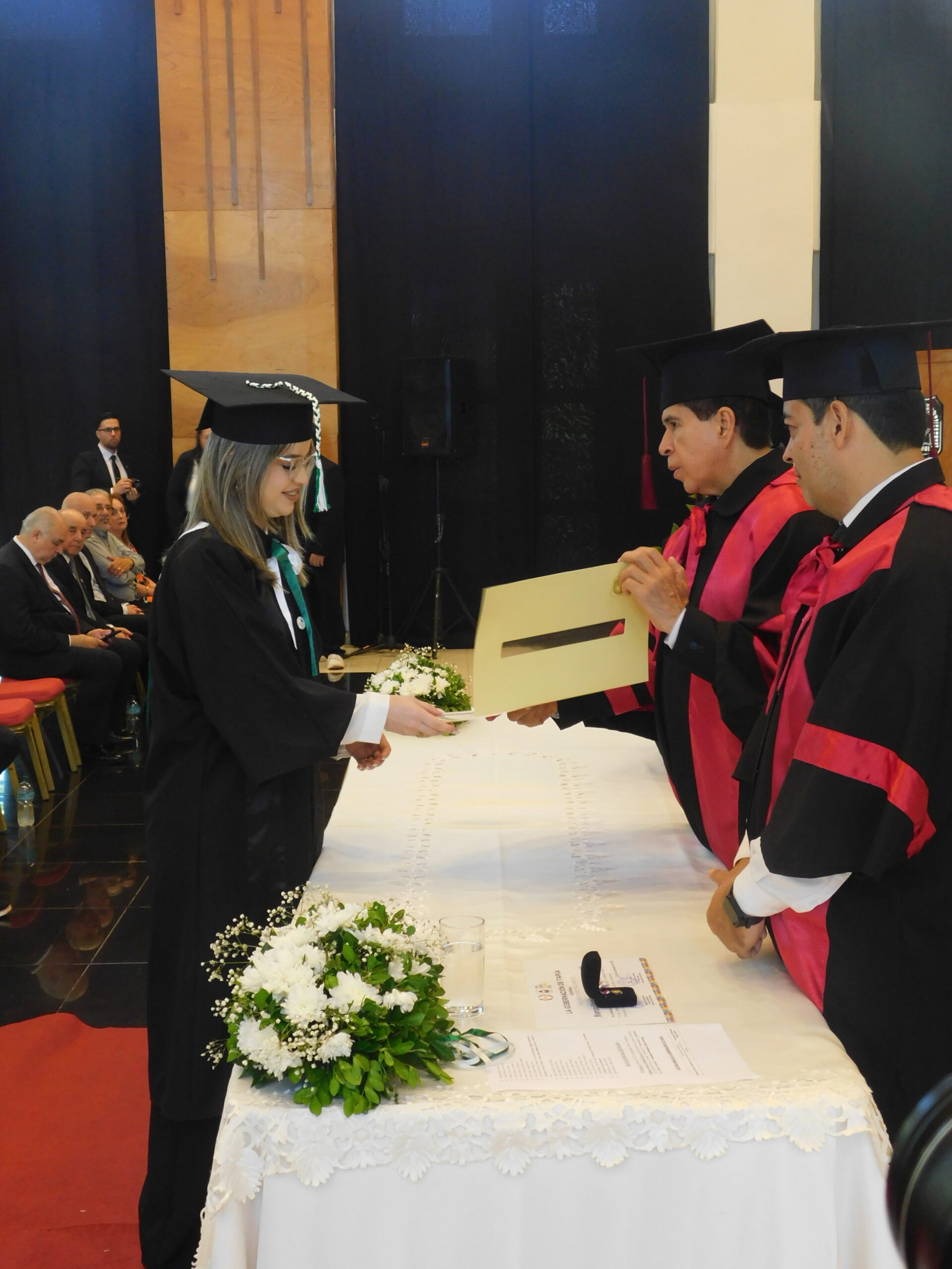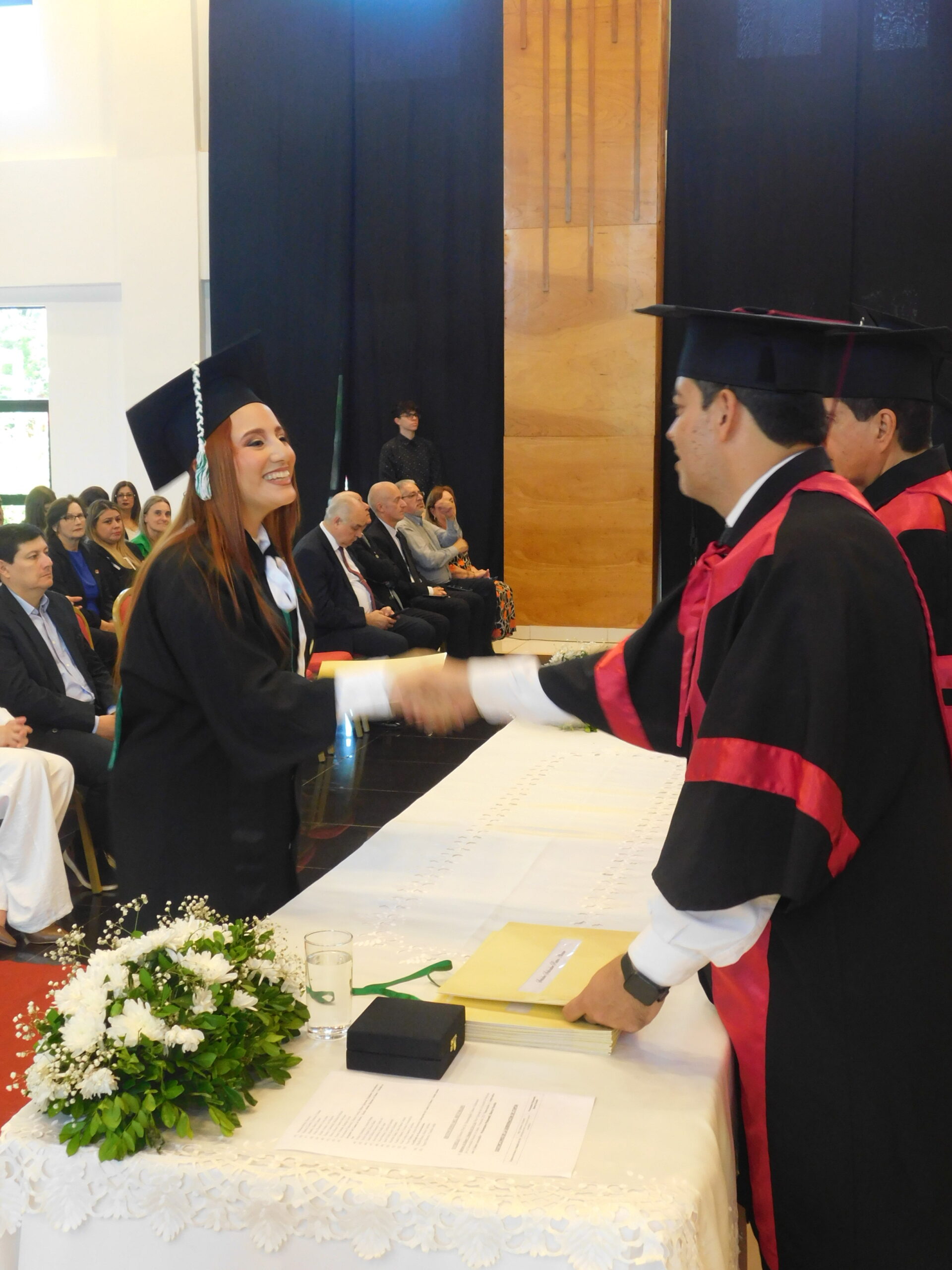Seguidamente, en representación de sus compañeros, la Mejor Egresada, Bianca Fiorella Provenzano Pinkoski, dirigió unas palabras de agradecimiento. Expresó su profundo reconocimiento a las autoridades universitarias por su compromiso con la formación de profesionales íntegros y por mantener la excelencia académica que distingue a la facultad.
