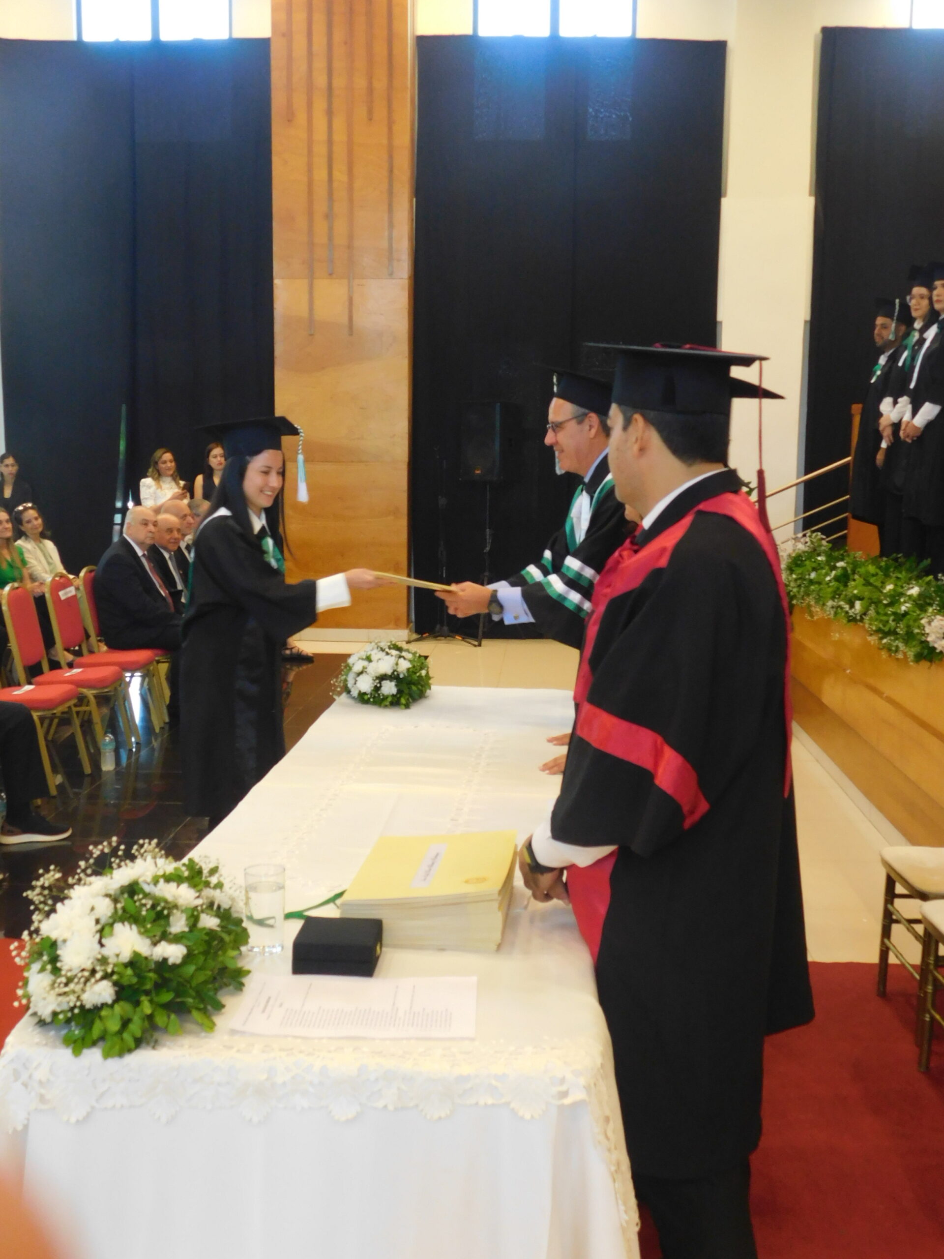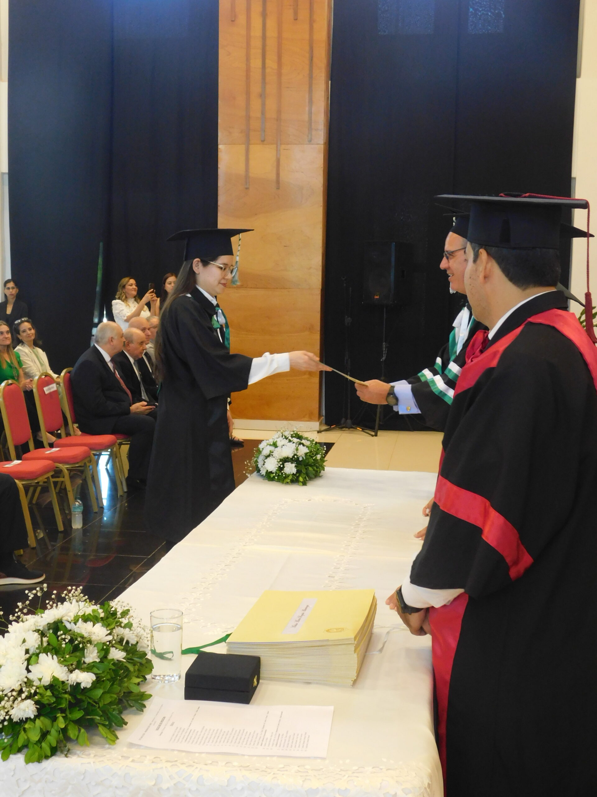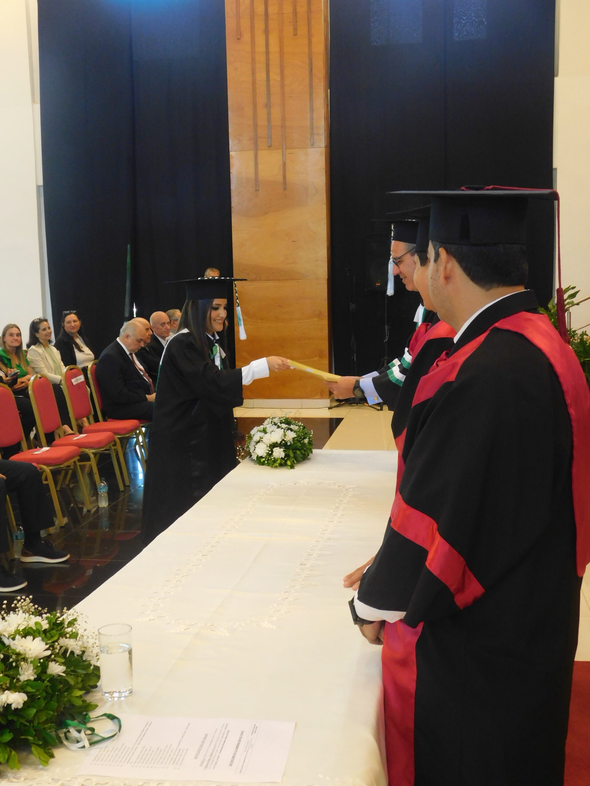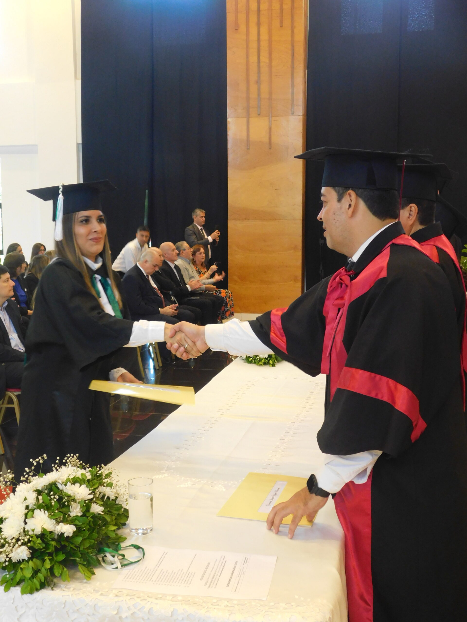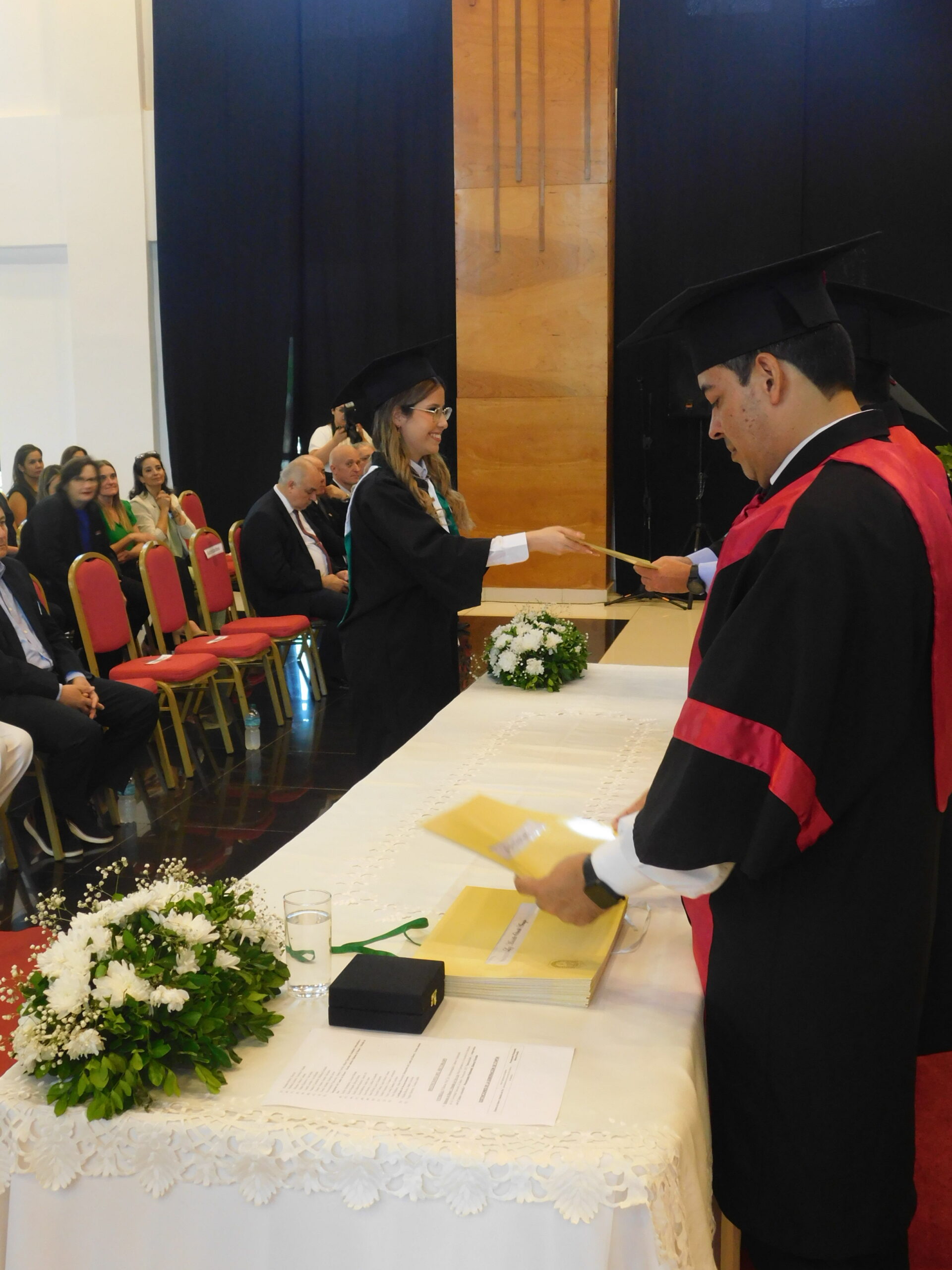Seguidamente, en representación de sus compañeros, la Mejor Egresada, Bianca Fiorella Provenzano Pinkoski, dirigió unas palabras de agradecimiento. Expresó su profundo reconocimiento a las autoridades universitarias por su compromiso con la formación de profesionales íntegros y por mantener la excelencia académica que distingue a la facultad.