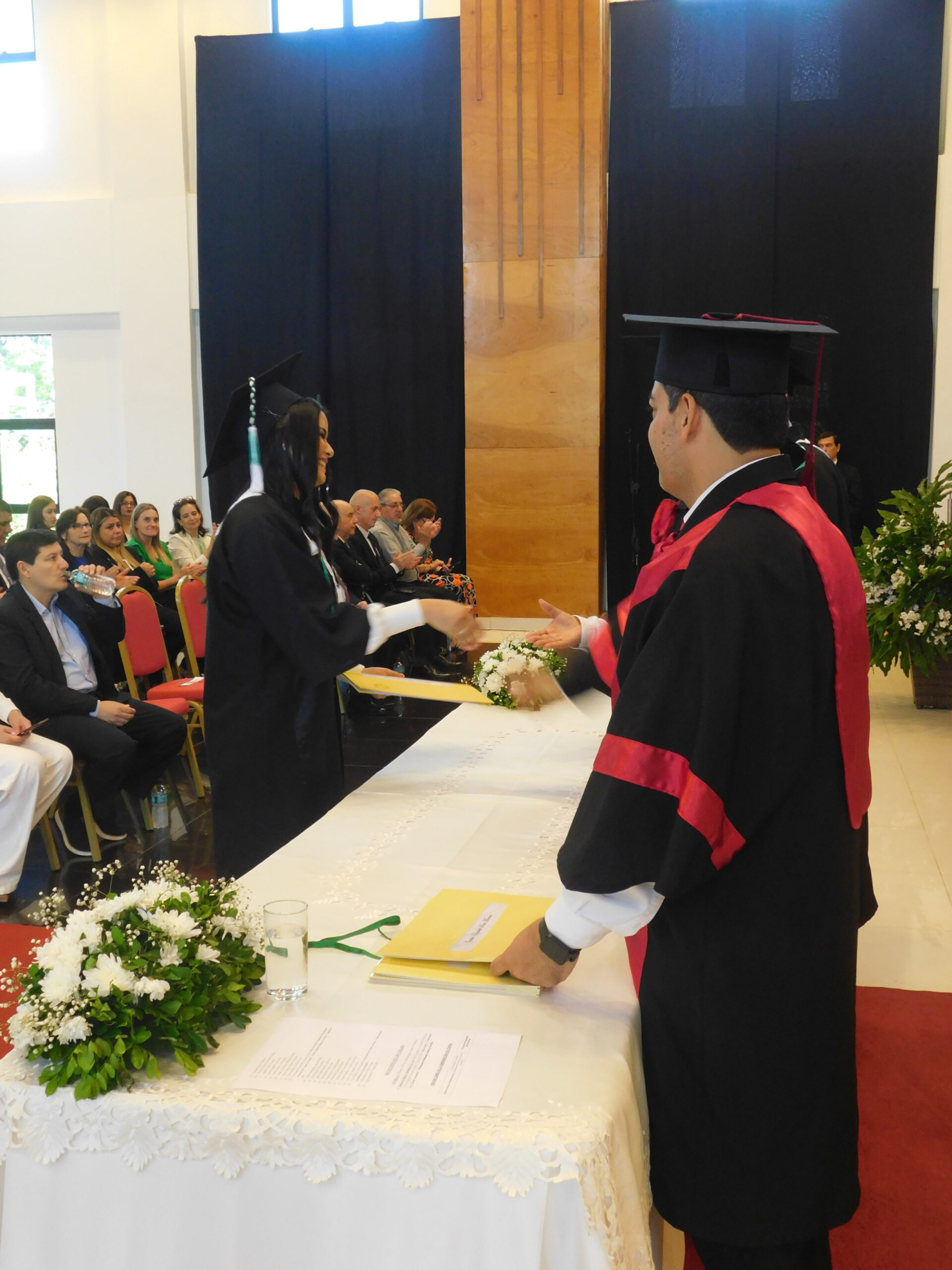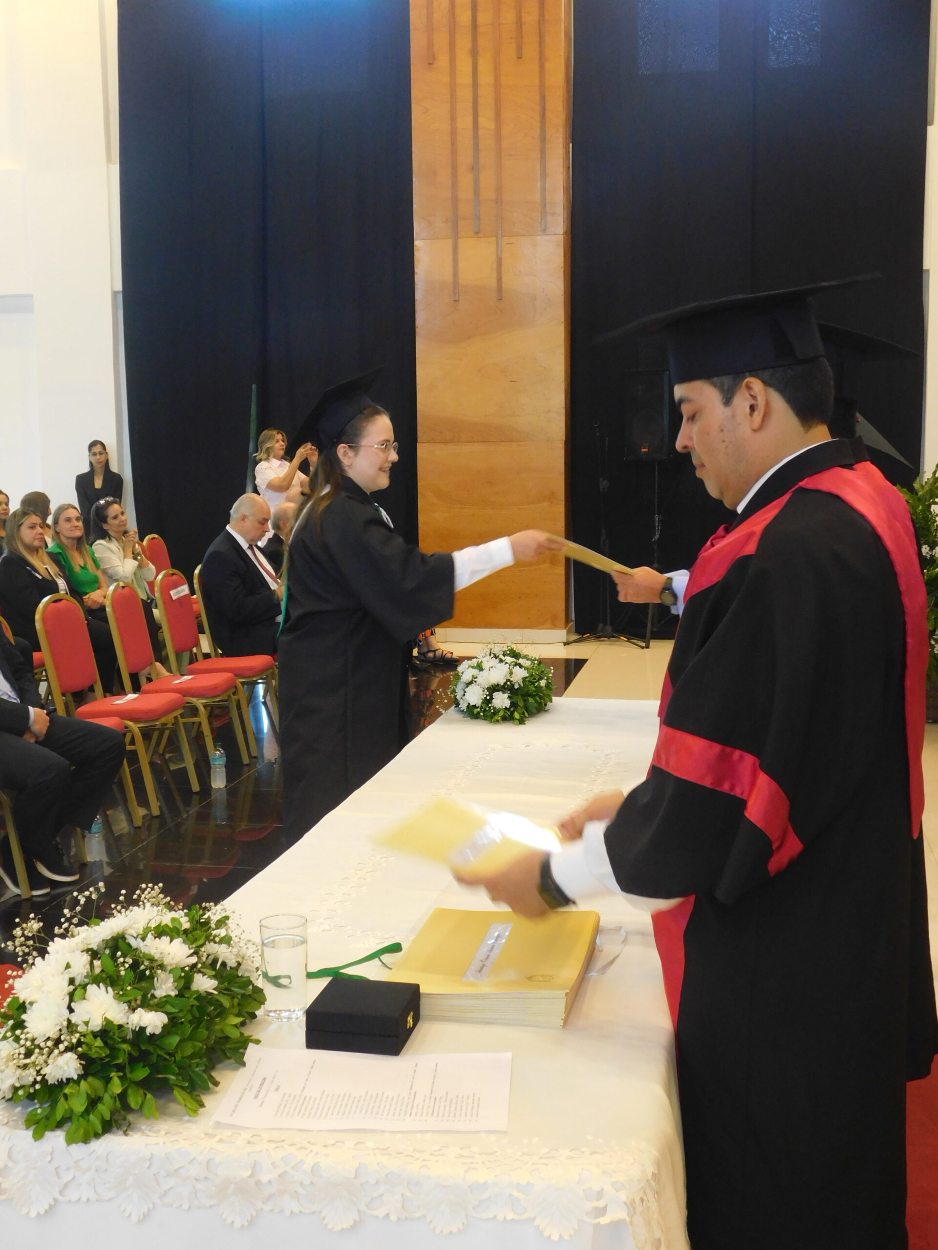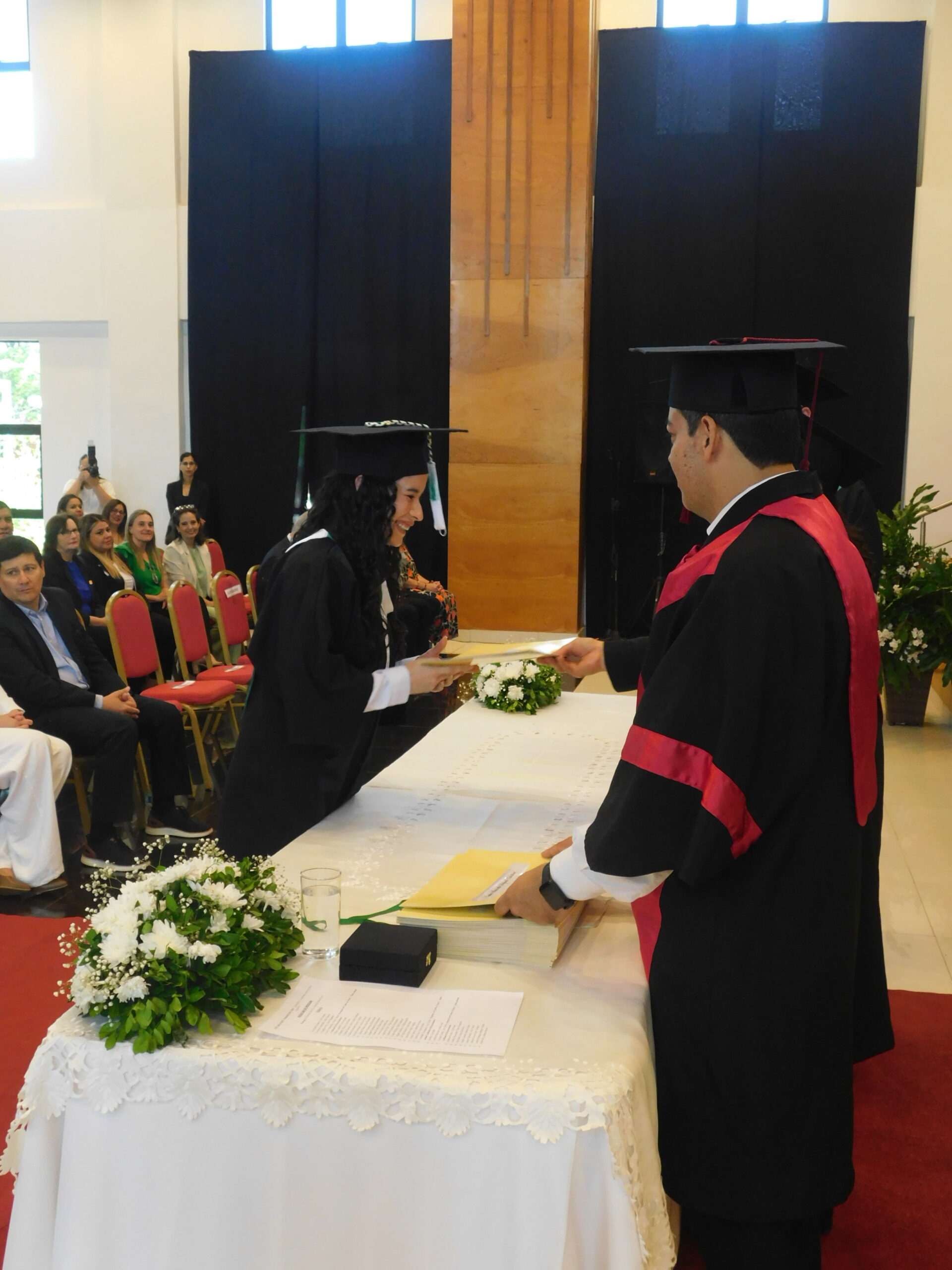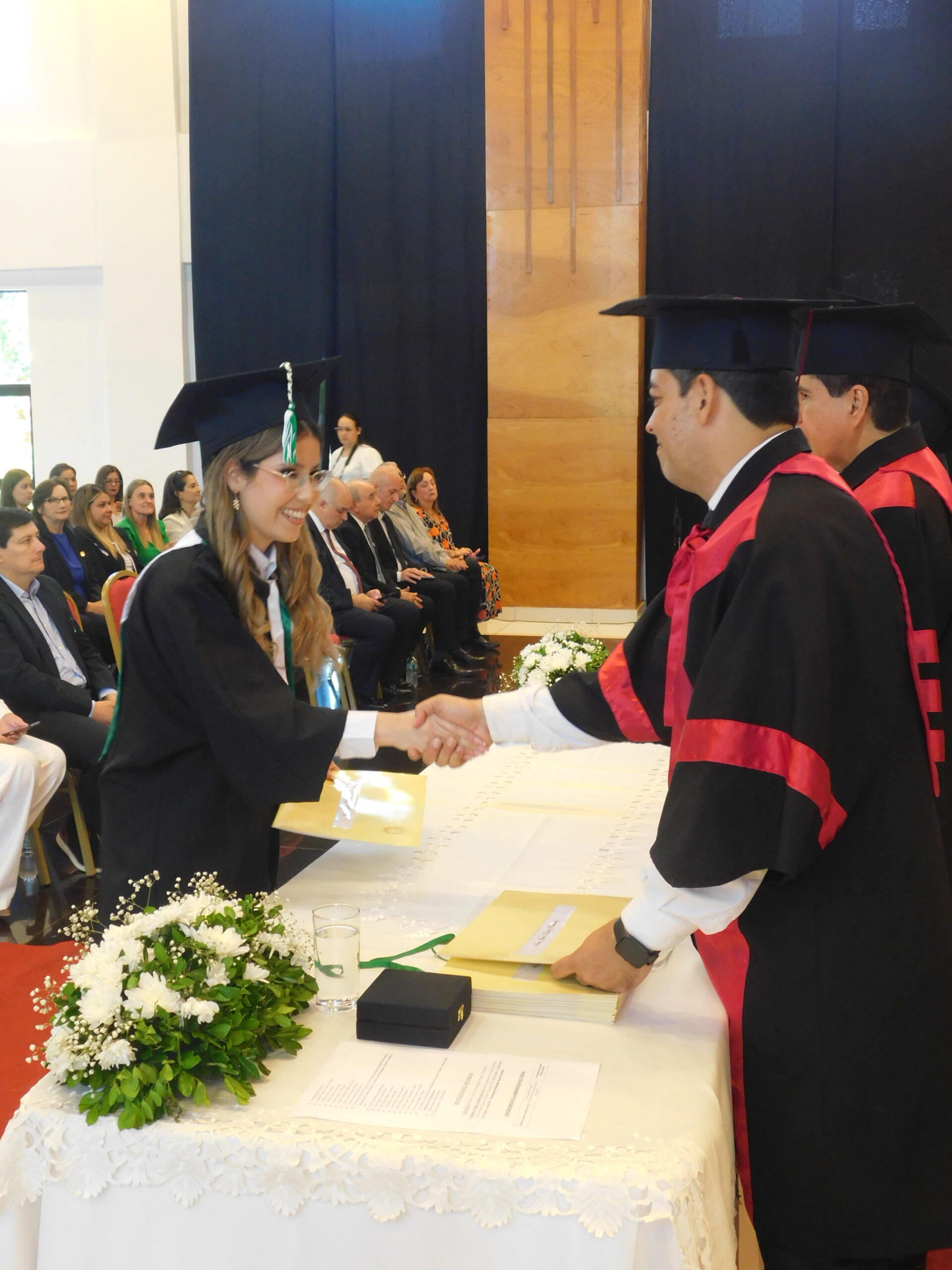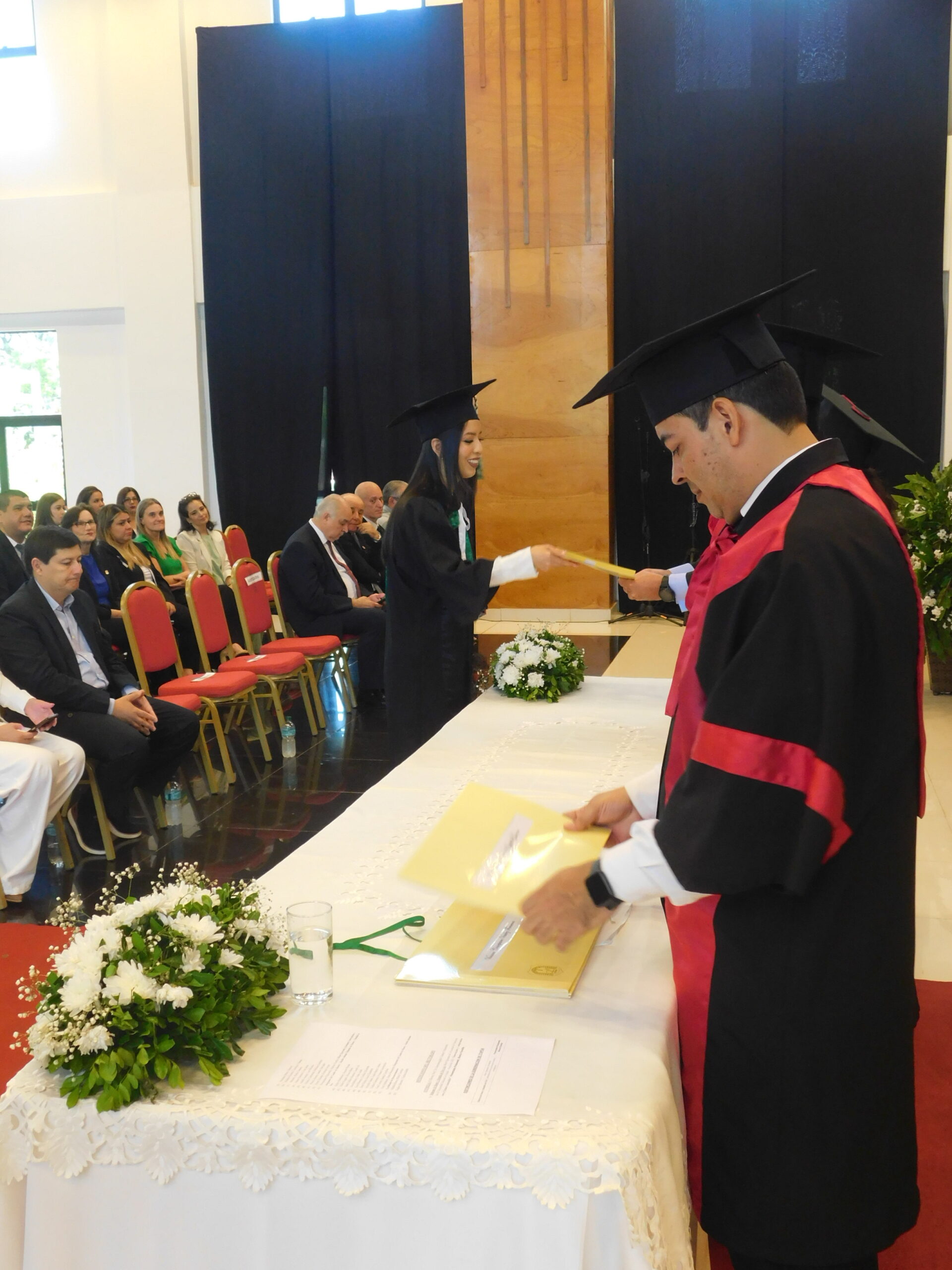 A continuación, se procedió a la entrega de distinciones honoríficas a la Mejor Egresada y a la Estudiante Sobresaliente de Medicina, en reconocimiento a su desempeño académico. Las distinciones fueron entregadas por el Dr. Diego Berdejo, en su calidad de Secretario de Salud de la Gobernación de Itapúa.