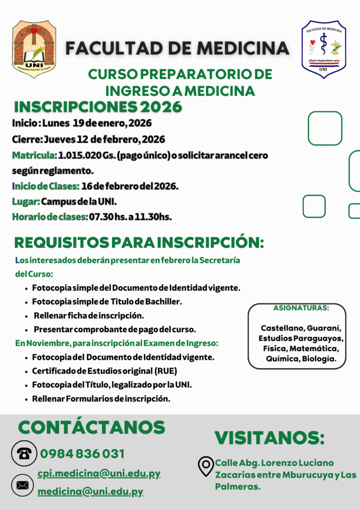 Desde la fecha 19 de enero hasta el 12 de febrero se da inicio a la inscripción del Curso Preparatorio de Ingreso del periodo 2026, de forma Presencial, de 07:00 a 11:30 hs. en Sede Campus.